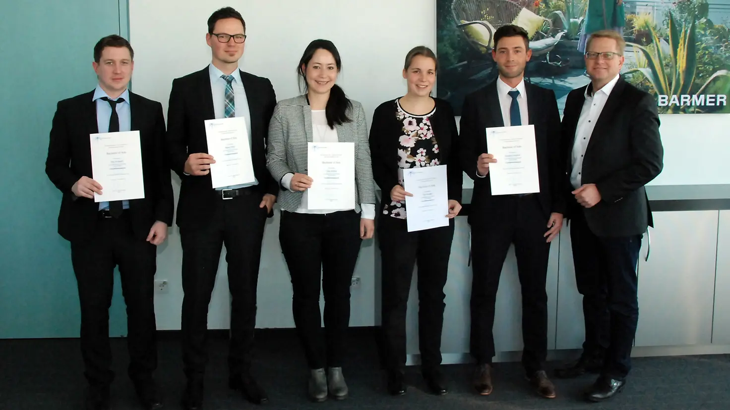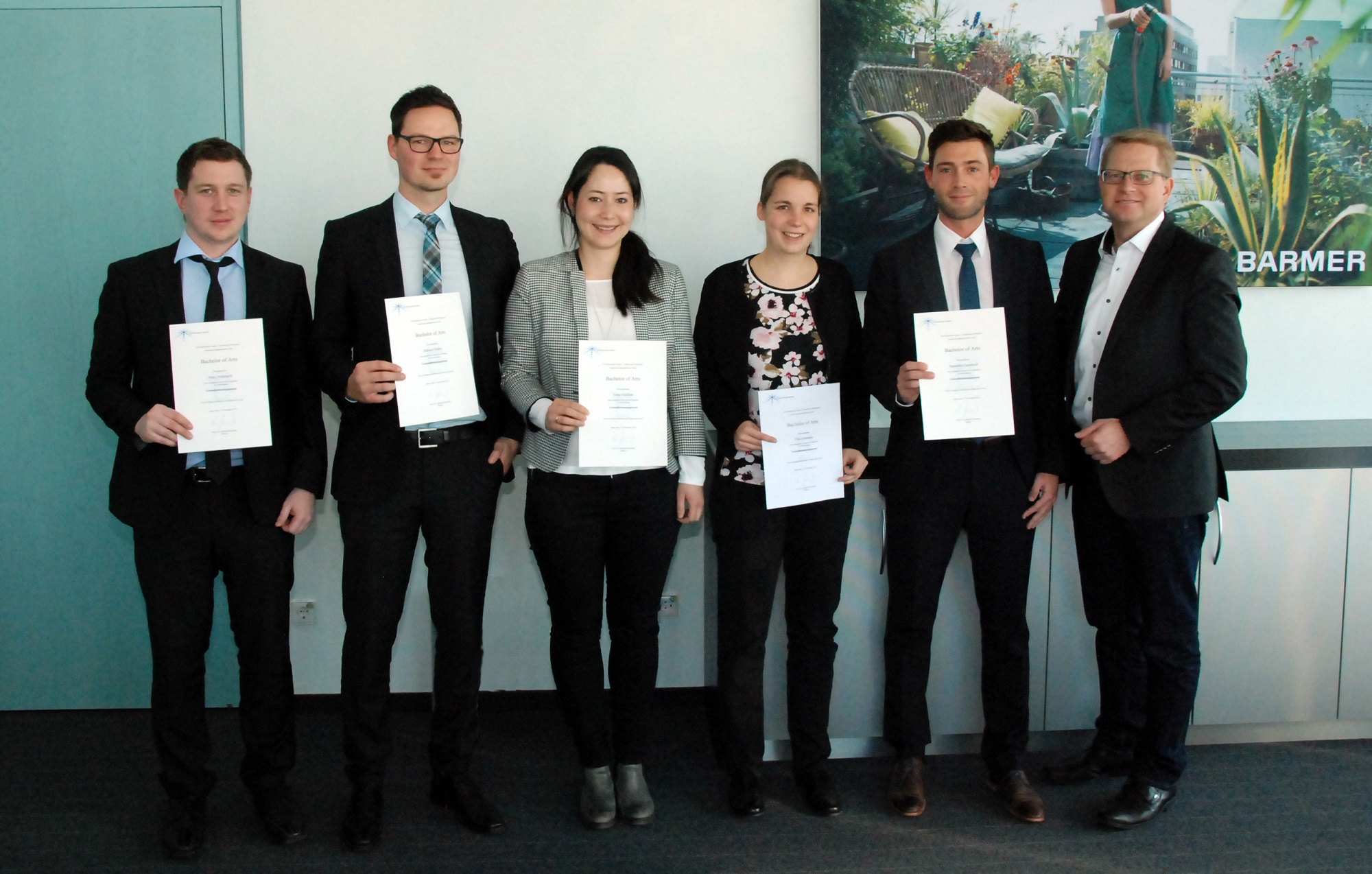 Redaktionen können dieses zum Download zur Verfügung gestellte Motiv kostenfrei im Rahmen ihrer Berichterstattung nutzen. Bitte verwenden Sie dabei als Quellenhinweis „Barmer“. Zu sehen sind Marc Nothdurft, Manuel Weber, Tanja Meißner, Tina Grünauer, Benedikt Eisenbeiß und Barmer Bereichsvorstand Alexander Stütz (v.l.n.r.). Als Bildunterschrift schlagen wir vor: Fünf Barmer Mitarbeiter haben von Vorstand Alexander Stütz ihre Bachelor-Urkunde erhalten, darunter die Jahrgangsbeste, Tina Grünauer.