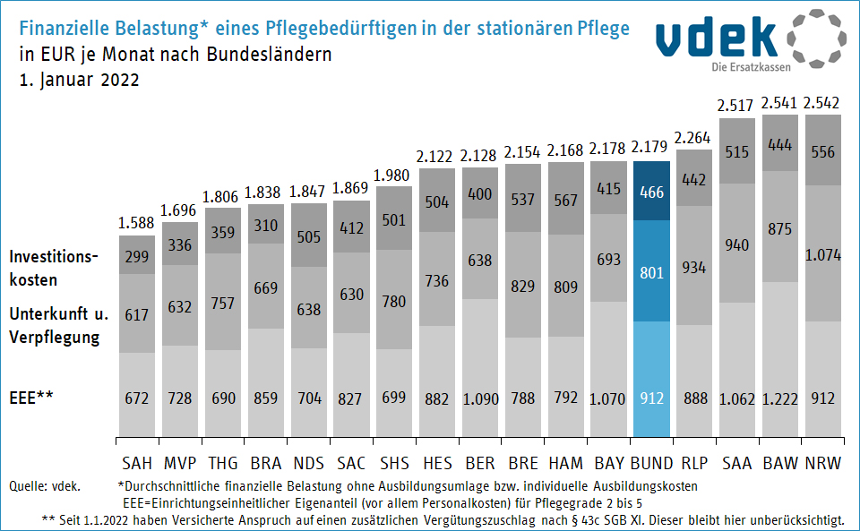 In keinem anderen Bundesland werden die Menschen so alt wie in Baden-Württemberg. Das ist eine gute Nachricht. Mit dem Alter steigt aber auch das Pflegerisiko. Seit 2017 ist die Zahl der Pflegebedürftigen um mehr als 18 Prozent auf fast 472.000 gestiegen. Und Baden-Württemberg ist eines der teuersten Bundesländer, wenn es um die Unterbringung von Pflegebedürftigen in einem Heim geht. Jeden Monat zahlen Pflegeheimbewohnerinnen und -bewohner hierzulande mehr als 2.500 Euro aus der eigenen Tasche. Die Landesregierung könnte deren finanzielle Belastung um rund 500 Euro reduzieren, wenn sie die sogenannten Investitionskosten übernehmen würde. Die Investitionskosten fallen in der stationären Pflege für die Beschaffung der Immobilie, Instandsetzung und Instandhaltung an. Ebenso werden Betten, Tische, Stühle und Fahrzeuge über die Investitionskosten finanziert. Baden-Württemberg ist im Jahr 2010 aus der öffentlichen Förderung von stationären Pflegeheimen ausgestiegen. Barmer Landesgeschäftsführer Winfried Plötze kritisiert das. "Das Land sollte die Investitionskosten wieder übernehmen, um so für eine bezahlbare Pflegeinfrastruktur zu sorgen. Das ist sein gesetzlicher Auftrag."