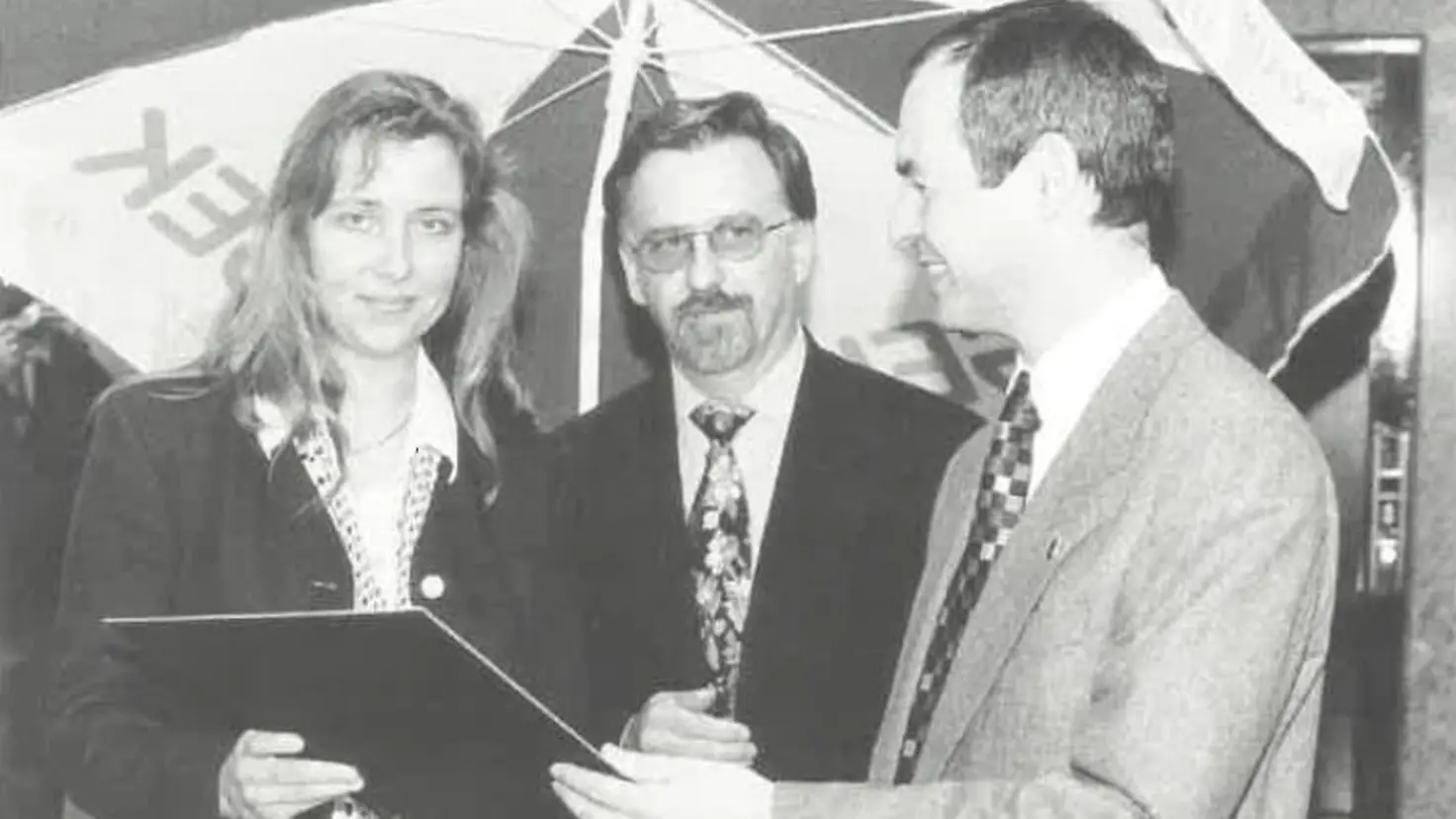 Anka Hofmann ist die erste Trainerin des Jahres. Sie erhält die Auszeichnung von GEK-Vorstand Dieter Hebel (mitte) und dem damaligen Staatssekretär Rudolf Köberle.
