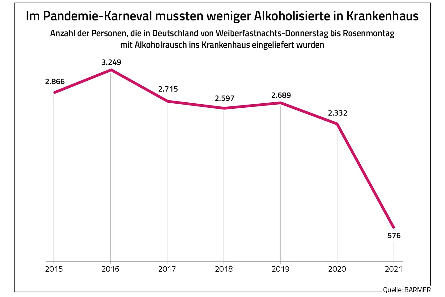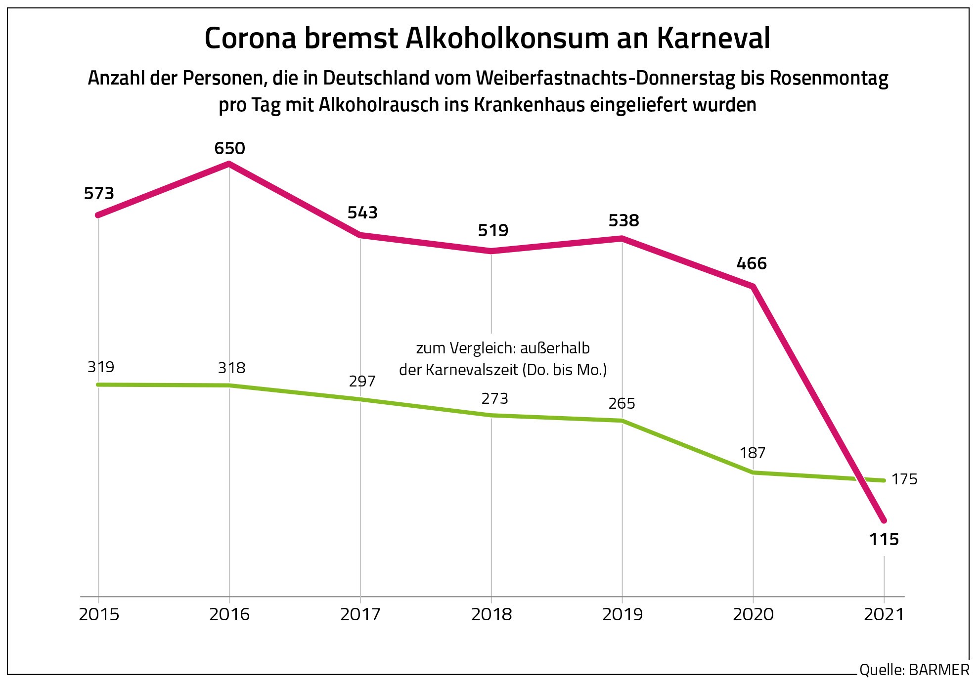 Wie aus der Barmer-Analyse weiter hervorgeht, kamen von Weiberfastnacht bis Rosenmontag des Jahres 2020 bundesweit 2.332 Menschen wegen übermäßigem Alkoholkonsum ins Krankenhaus. Im Jahr 2021 sank die Zahl auf 576 Betroffene, was einem Rückgang von fast 75 Prozent entspricht. „Wegen des Lockdowns kamen während des letzten Faschings viel weniger Menschen als im Vorjahr wegen Alkoholmissbrauchs ins Krankenhaus. Die Fallzahlen lagen sogar unter dem Jahresdurchschnitt“, so Wöhler. So seien während der wichtigsten Faschingstage, von Donnerstag bis Montag, im Schnitt 115 Personen täglich stationär behandelt worden. Über das komplette Jahr betrachtet seien von Donnerstag bis Montag dagegen durchschnittlich 175 stark Alkoholisierte je Tag ins Krankenhaus gekommen. Dieser vergleichsweise höhere Wert könne an dem zeitweisen Ende der Corona-Beschränkungen liegen.