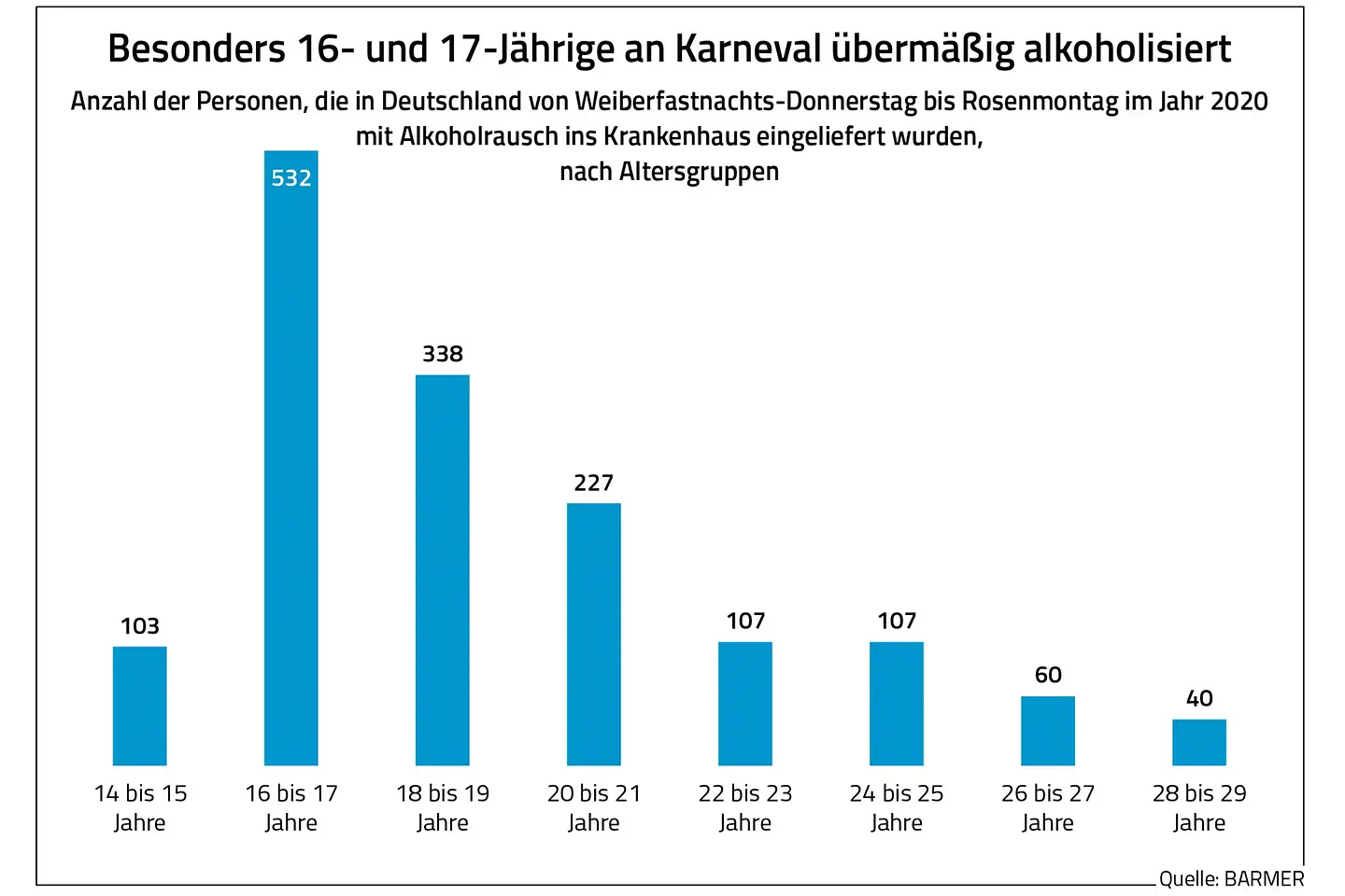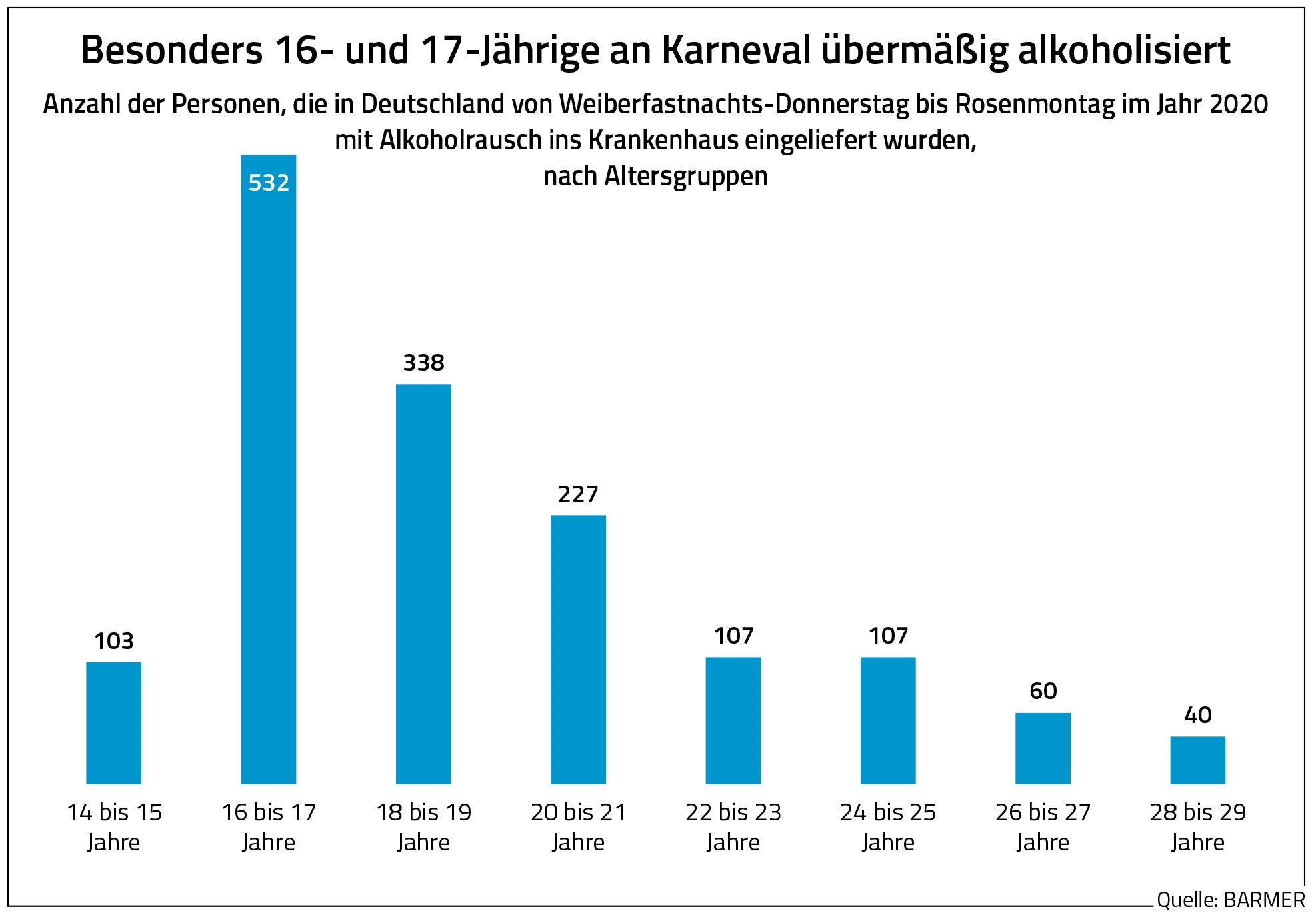München, 28. Februar 2022 – Vor allem 16- und 17-Jährige müssen an den Faschingstagen ins Krankenhaus, weil sie zu viel Alkohol getrunken haben. Das geht aus einer Analyse des Barmer Instituts für Gesundheitssystemforschung bifg hervor. Im Jahr 2020 wurden demnach bundesweit 532 Teenager an Fasching stark alkoholisiert ins Krankenhaus gebracht. In den nachfolgenden Altersgruppen sanken die Zahlen rapide ab. Beispielsweise waren es unter den 22- bis 23-Jährigen nur 107 Personen, die wegen eines Alkoholrausches stationär behandelt werden mussten. „Junge Menschen wissen bei Alkohol häufig noch nicht, wo ihre Grenzen sind. Daher sollten alle Erziehungsberechtigten immer wieder auf die Gefahren von übermäßigem Alkoholkonsum hinweisen. Es geht darum, die Jugendlichen zumindest auf die Risiken von Alkohol hin zu sensibilisieren“, sagt Prof. Dr. Claudia Wöhler, Landesgeschäftsführerin der Barmer in Bayern.