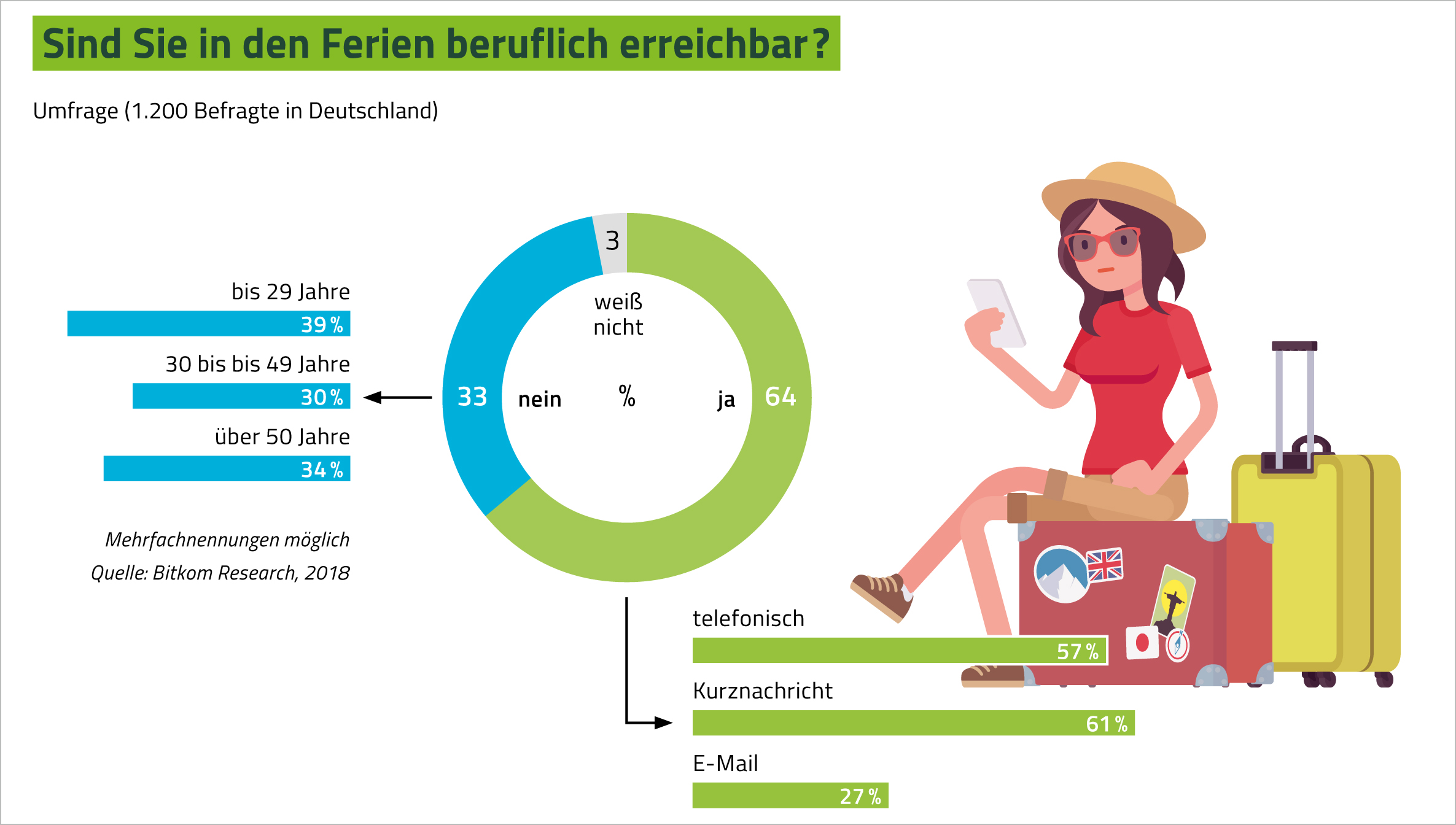 München, 4. Juli 2019 – Die große Mehrheit der Beschäftigten ist für ihre Arbeitgeber auch im Urlaub erreichbar. Eine Umfrage unter 1.200 Beschäftigten hat ergeben, dass 64 Prozent der Arbeitnehmer auch im Urlaub erreichbar sind – sei es telefonisch (57 Prozent), per Kurznachricht (61 Prozent) oder per E-Mail (27 Prozent). "Arbeitgeber haben eine Fürsorgepflicht uns sollten sehr an der Gesunderhaltung ihrer Mitarbeiter interessiert sein. Daher ist es sinnvoll, die Beschäftigten dabei zu unterstützen, sich ausreichend zu erholen", sagt Professor Dr. Claudia Wöhler, Landesgeschäftsführerin der Barmer in Bayern.