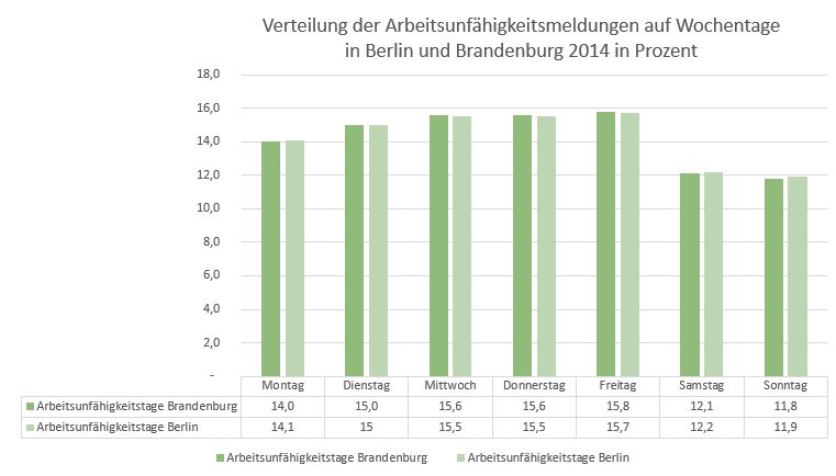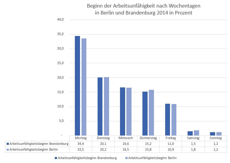In Brandenburg erfolgten 34,4 Prozent aller ärztlichen Arbeitsunfähigkeitsbescheinigungen im Jahr 2014 an einem Montag, in Berlin 33,5 Prozent. Der Grund hierfür ergibt sich zum einen aus den typischen Arbeitszeiten der Arbeitnehmer. Sie haben in der Regel am Wochenende frei und müssen sich deshalb nicht sofort krankmelden. Zum anderen haben, abgesehen von Notdiensten, Arztpraxen am Wochenende zumeist geschlossen. Der Arztbesuch wird daher am Montag nachgeholt. Folglich beginnen auch nur rund drei Prozent der Krankschreibungen am Wochenende.
