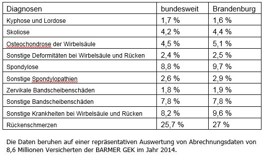 Ein haltungsschonender Arbeitsplatz ist schon deswegen wichtig, da es in Brandenburg überdurchschnittlich viele Bürger im Kreuz haben. Bei 27 Prozent wurden im Jahr 2014 in der Praxis oder im Krankenhaus Rückenschmerzen diagnostiziert. Bundesweit waren es mit knapp 25,7 Prozent etwas weniger. Dabei sind Rückenleiden wie Bandscheibenvorfälle oder die Spondylose noch gar nicht mit eingerechnet (siehe Tabelle).