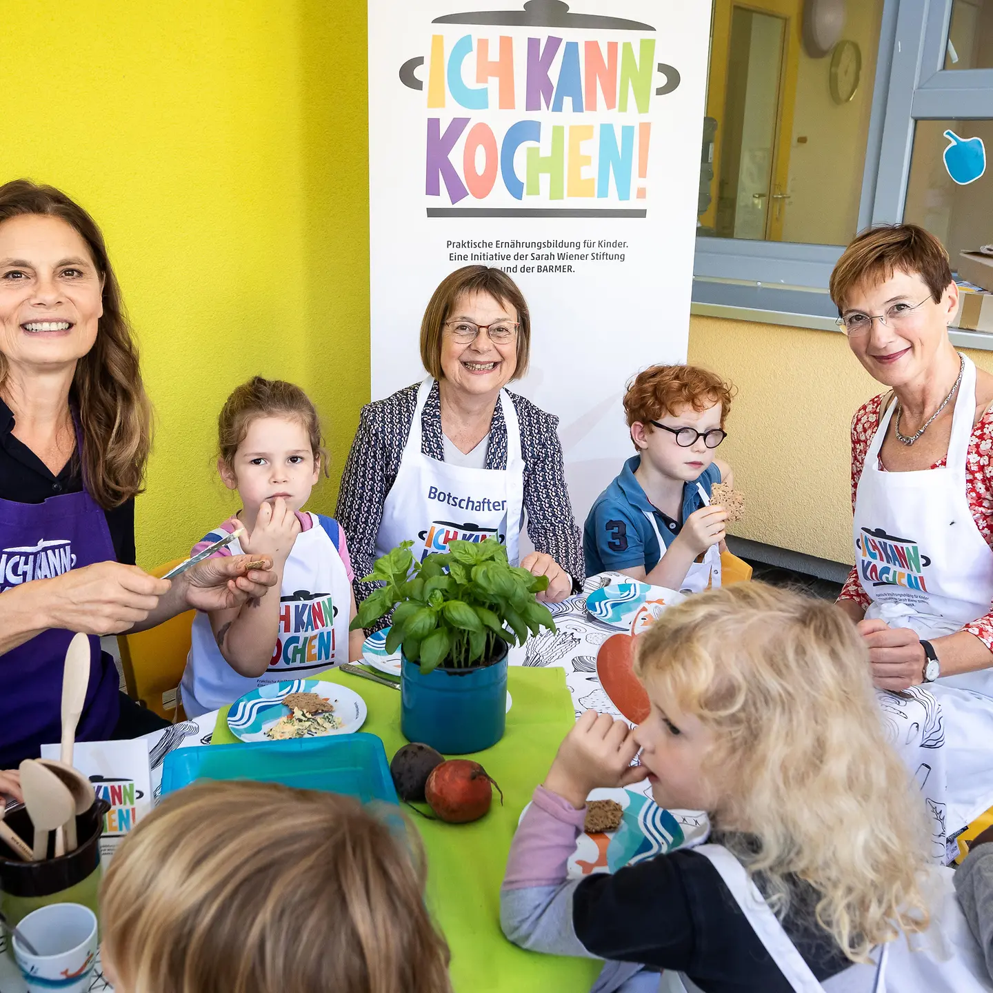 Großer Rummel herrschte am 9. September 2022 in der Kita Regenbogenland in Potdsam. Die Kinder der Koch-AG erhielten prominente Unterstützung in der Küche. Ursula Nonnemacher, Ministerin für Soziales, Gesundheit, Integration und Verbraucherschutz des Landes Brandenburg, Starköchin Sarah Wiener und Barmer-Landesgeschäftsführerin Gabriela Leyh halfen den Kindern, Gemüse für die Sandwichbutter zu schneiden und den Teig für das Knäckebrot anzurühren. Gemeinsam feierten Groß und Klein so die Ernennung von Ministerin Nonnemacher zur Botschafterin von Ich kann kochen!
