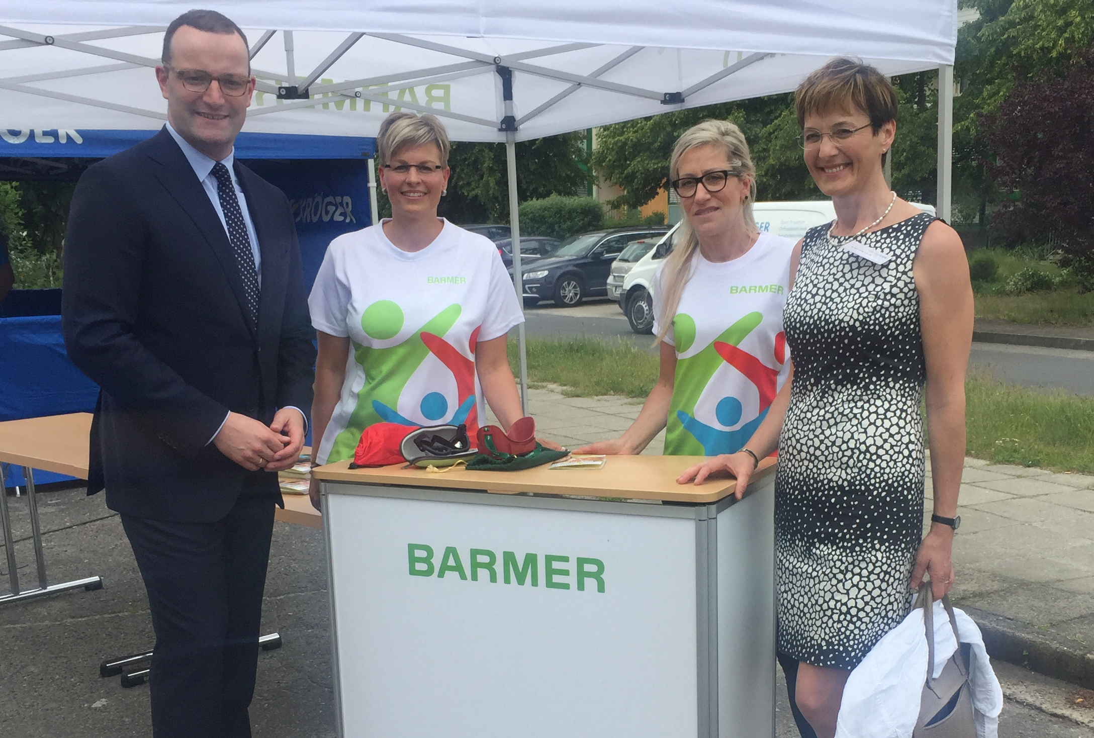 V. l. n. R. Jens Spahn, Bundesgesundheitsminister, Maraike Schirrgott und Petra Holz von der Barmer-Geschäftsstelle Senftenberg, Gabriela Leyh, Landesgeschäftsführerin der Barmer Berlin/Brandenburg