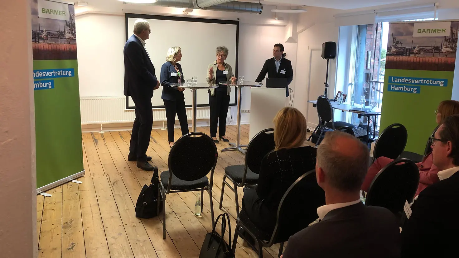 Diskutierten auf dem Podium: v.l.n.r. Jörn Wessel (Zweiter Vorsitzender der Hamburgischen Krankenhausgesellschaft), Caroline Roos (Stellvertretende Vorsitzende der Kassenärztlichen Vereinigung Hamburg), Dr. Susanne Klein (Landesgeschäftsführerin Barmer Hamburg), Karsten Schulz (Pressesprecher Barmer Landesvertretung Hamburg)