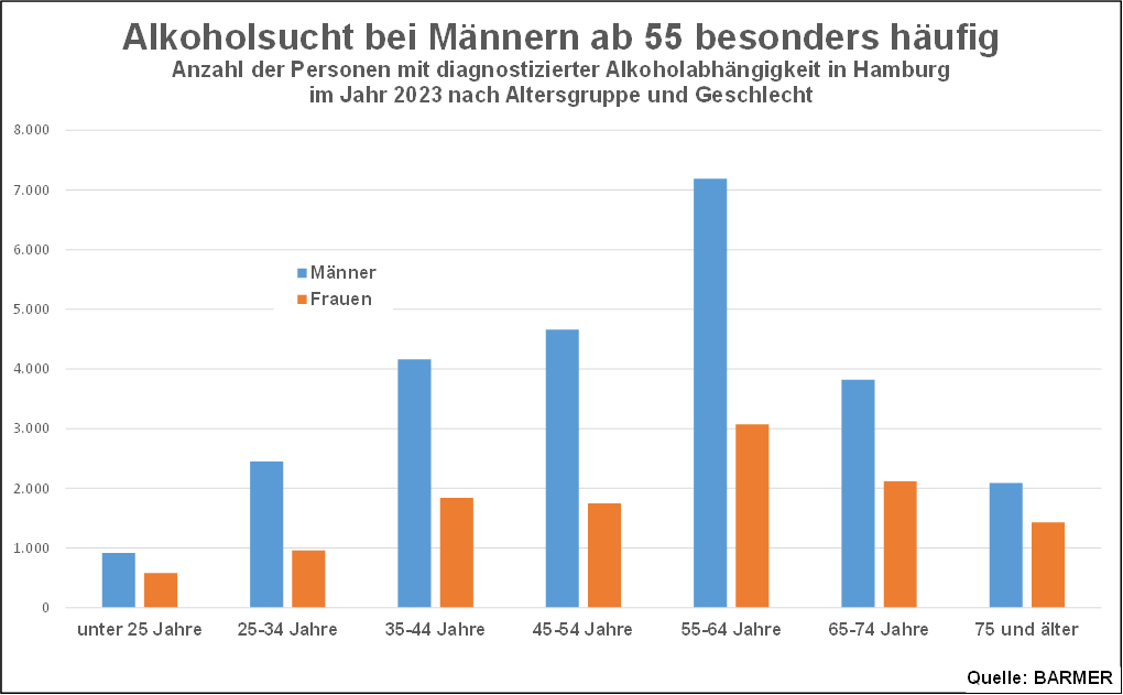 Hamburg, 16. Januar 2025 – In Hamburg sind 37.040 Menschen wegen Alkoholsucht in medizinischer Behandlung. Das geht aus einer aktuellen Auswertung des Barmer Instituts für Gesundheitssystemforschung (bifg) für das Jahr 2023 hervor. Besonders häufig betroffen sind Menschen in der zweiten Lebenshälfte. Bei den 55- bis 64-Jährigen ist im genannten Zeitraum Alkoholsucht bei rund 7190 Männern und 3070 Frauen diagnostiziert worden.
