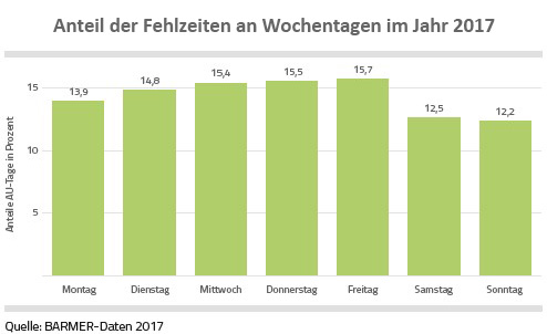 Hamburg, 8. Oktober 2018 – Wenn vom „Blauen Montag“ die Rede ist, zucken Arbeitgeber immer noch zusammen. „Der Barmer Gesundheitsreport 2018 zeigt, dass die meisten Arbeitsunfähigkeitstage allerdings nicht montags, sondern mit 15,7 Prozent an einem Freitag zu verzeichnen sind. Montags sind lediglich 13,9 Prozent der erkrankten Erwerbstätigen arbeitsunfähig“, so Frank Liedtke, Landesgeschäftsführer der Barmer in Hamburg.