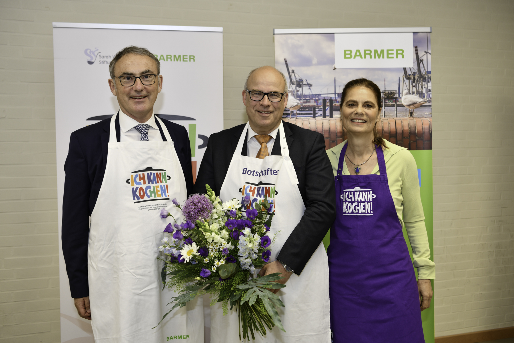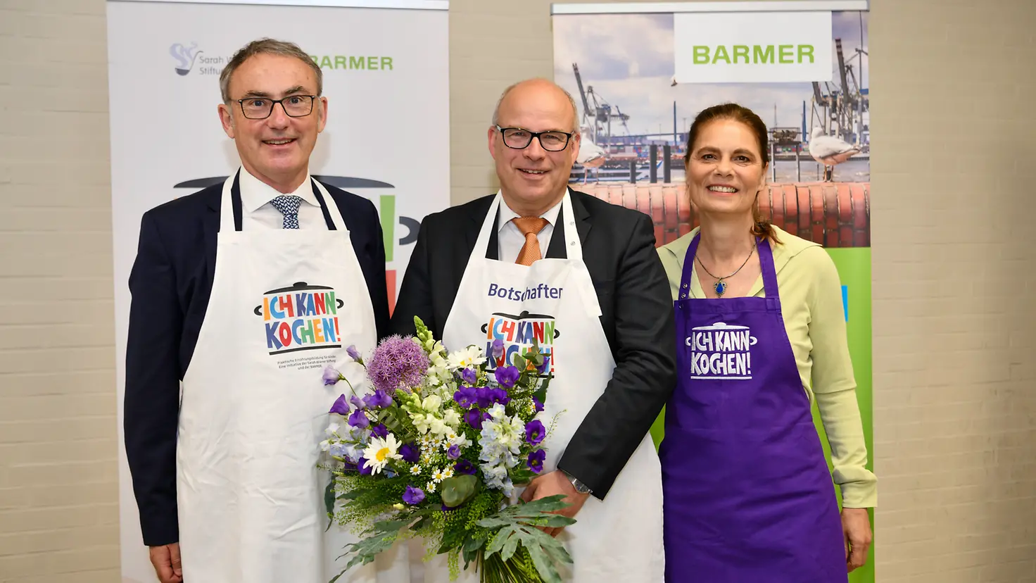 Prof. Dr. med. Christoph Straub, Vorstandsvorsitzender der Barmer (links) und Sarah Wiener, Vorständin Sarah Wiener Stiftung, ernennen Ties Rabe, Senator der Behörde für Schule und Berufsbildung in Hamburg, zum Botschafter von „Ich kann kochen!“.