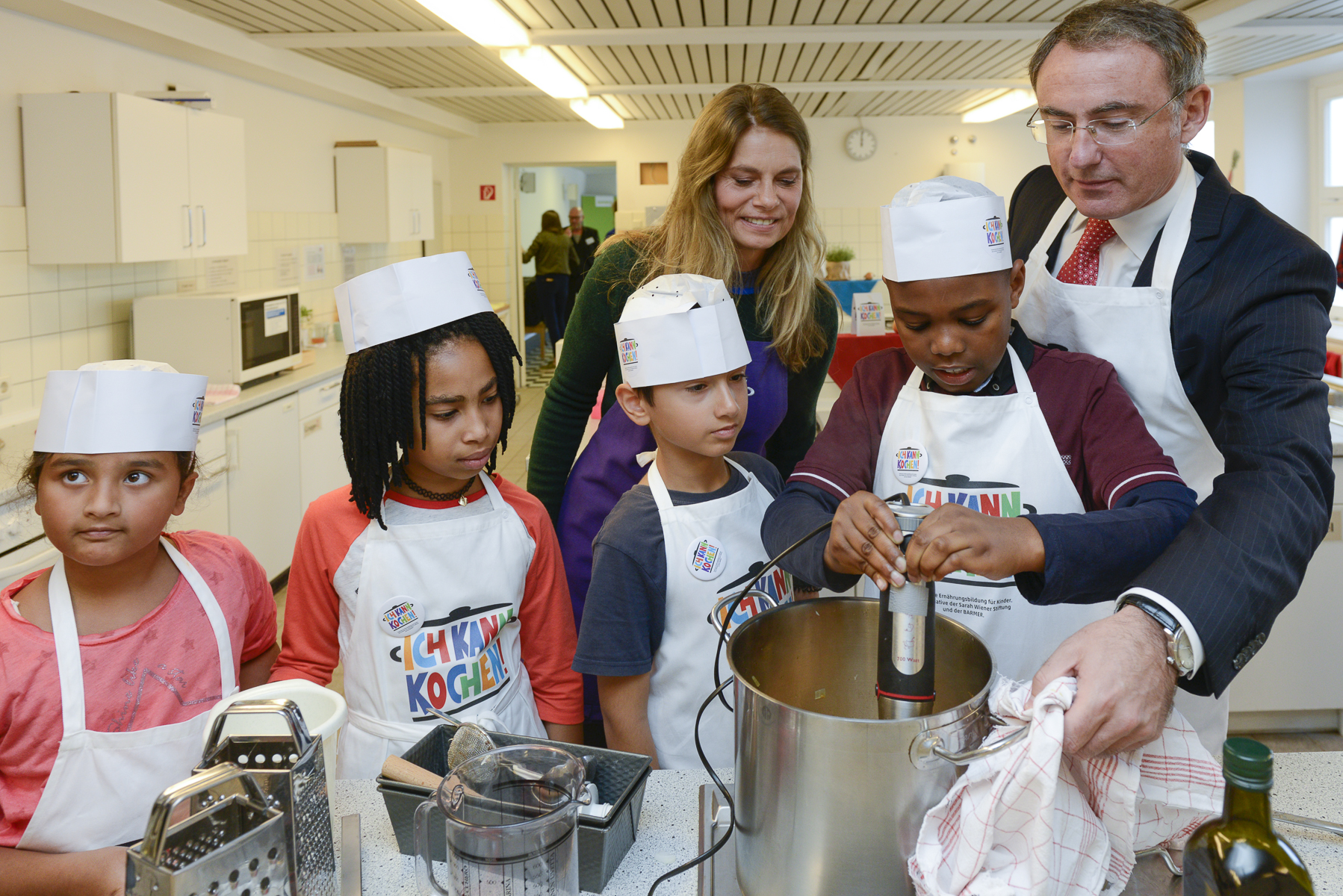 „Dank Ich kann kochen! können wir in der Nachmittagsbetreuung ein regelmäßiges Kochprogramm für die Kinder anbieten. Das ist gerade hier in Hamburg-Horn eine sinnvolle Ergänzung. Viele Kinder kennen das Erlebnis, gemeinsam zu kochen und gemeinsam am Tisch zu speisen, nicht“, sagte Alexandra Gelhausen“, Leiterin der Ganztagsbetreuung an der Schule „Beim Pachthof“. Gemeinsames Kochen und Essen finde in vielen Familien gar nicht mehr statt. „Das merkt man daran, dass ein Drittklässler das Messer falsch herum hält, mit der Schneidefläche nach oben“, sagte John Hendric Matthies, einer der Genussbotschafter an der Schule „Beim Pachthof“.