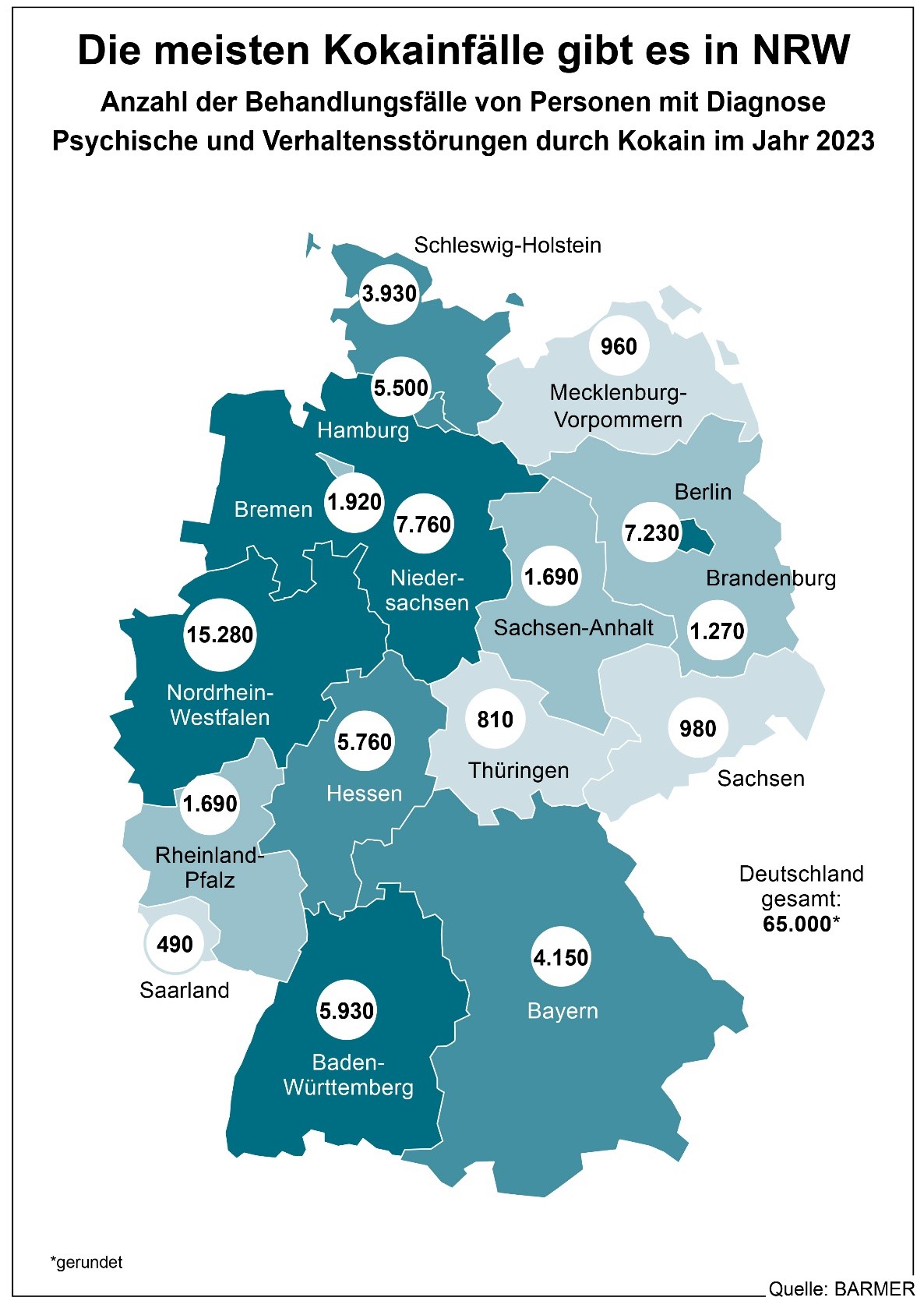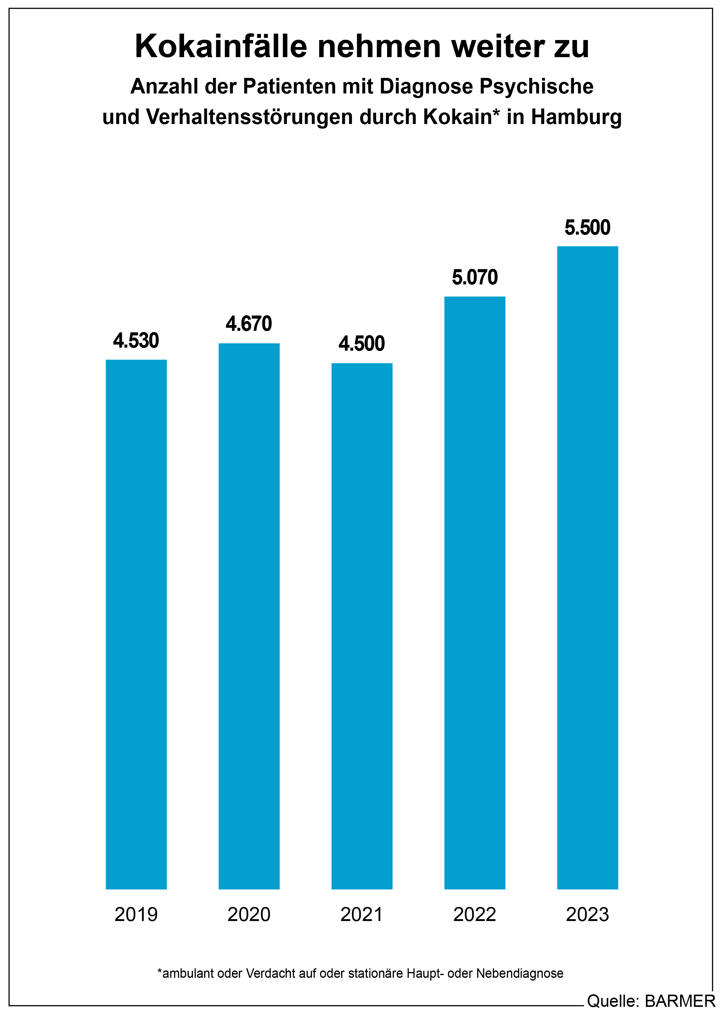 Hamburg, 30. Dezember 2024 – Immer mehr Menschen in Hamburg sind wegen Kokainmissbrauchs in ärztlicher Behandlung. Das zeigt eine aktuelle Auswertung des Barmer Instituts für Gesundheitssystemforschung (bifg). Demnach wurden im Jahr 2019 landesweit schätzungsweise 4.530 Patientinnen und Patienten behandelt. Im Jahr 2023 waren es bereits 5.500 – das entspricht einem Anstieg um 21,4 Prozent. Bundesweit wurden im vergangenen Jahr rund 65.000 Patienten wegen Kokainmissbrauchs misshandelt. Die meisten Betroffenen mit 15.280 gab es in Nordrhein-Westfalen, gefolgt von Niedersachsen mit 7.760.