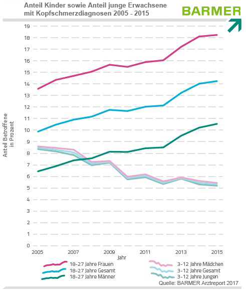 Im Hinblick auf Kopfschmerzdiagnosen bei Kindern im Alter von drei bis zwölf Jahren (typischerweise vor Eintritt in die Pubertät) und bei jungen Erwachsenen von 18 bis 27 Jahren kann ein gegenläufiger Trend beobachtet werden: Während die Kopfschmerzdiagnoseraten von 2005 bis 2015 bei Kindern um 35 Prozent gesunken sind, stiegen die Raten bei jungen Erwachsenen im gleichen Zeitraum um 42 Prozent. „Hier könnte zunehmender Druck in Schule und Ausbildung ein Grund sein“, so Frank Liedtke.