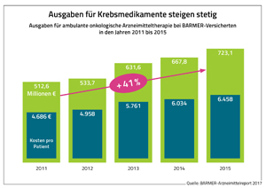 Hamburg, 25. Juli 2017 - Die Ausgaben für onkologische Arzneimittel in der ambulanten Versorgung sind innerhalb von fünf Jahren um 41 Prozent gestiegen. Das geht aus dem aktuellen Arzneimittelreport der Barmer hervor. Sie übertreffen damit deutlich die Kostensteigerung für alle anderen Arzneimittel (ohne Rezepturen), die um 20 Prozent wuchsen. Und dieser Trend setzt sich dynamisch fort. So haben sich beispielsweise die Therapiekosten zur medikamentösen Behandlung von Patienten mit Hautkrebs in fünf Jahren fast verneunfacht (von 1.309 auf 11.411 Euro).