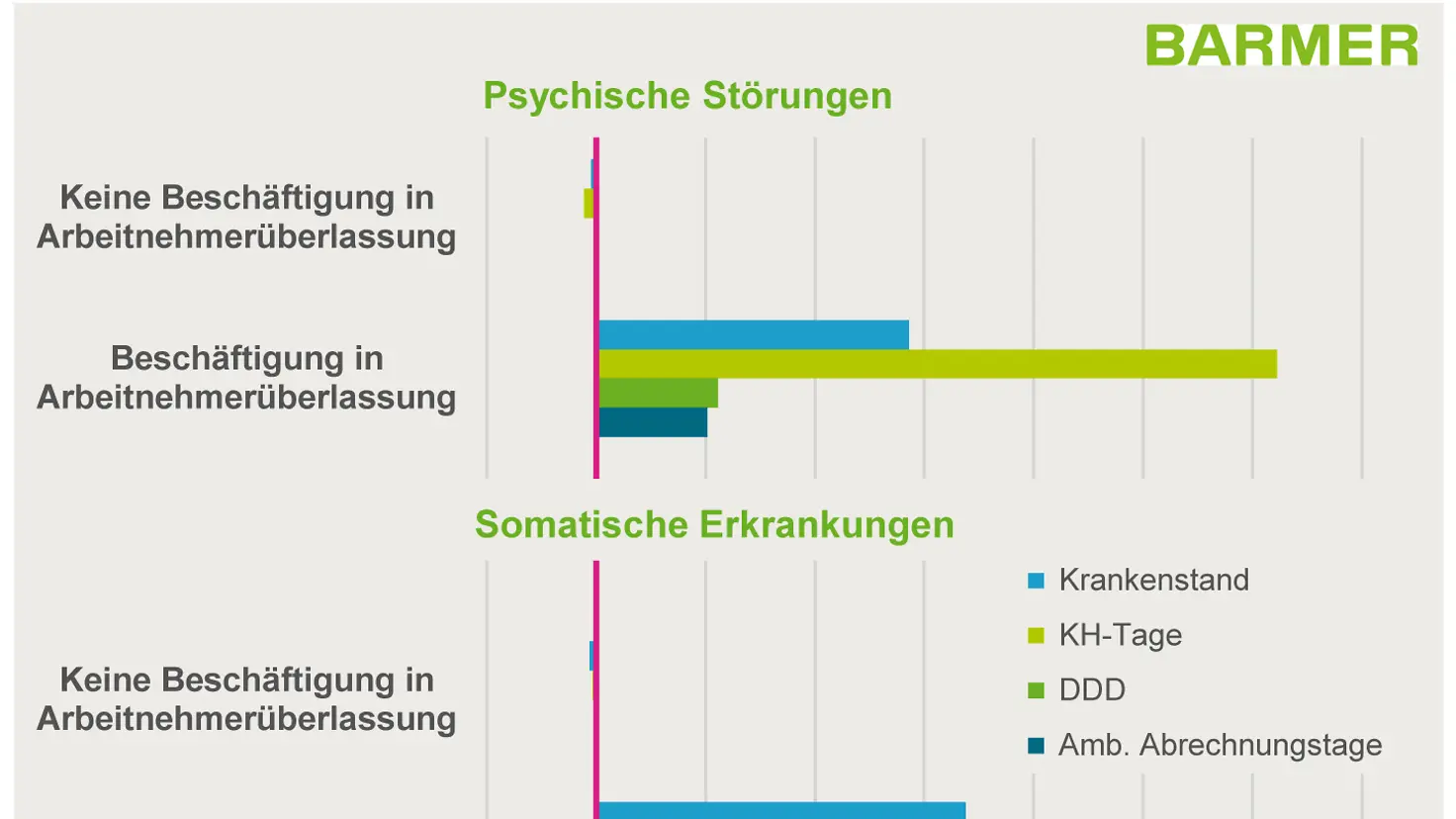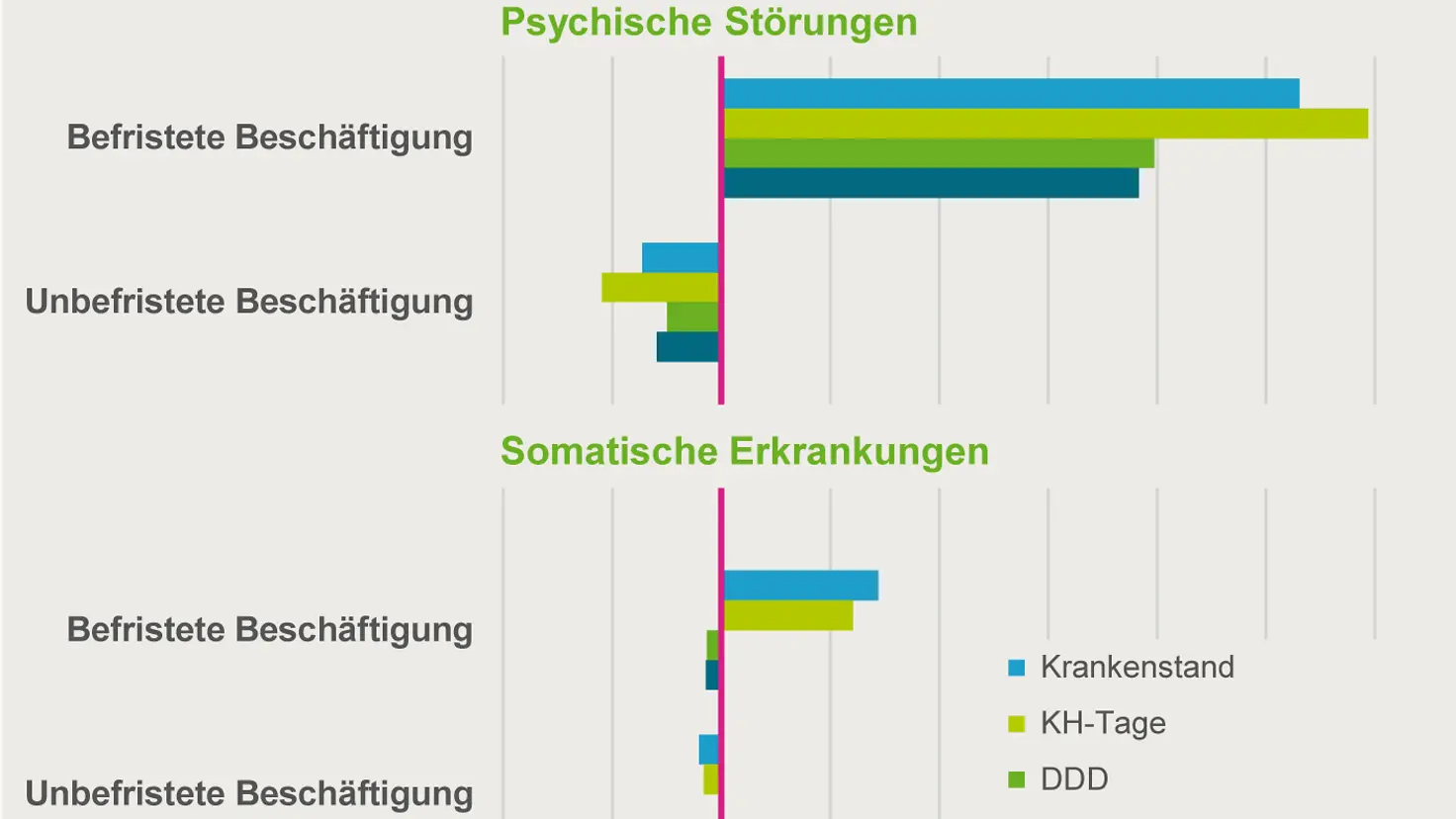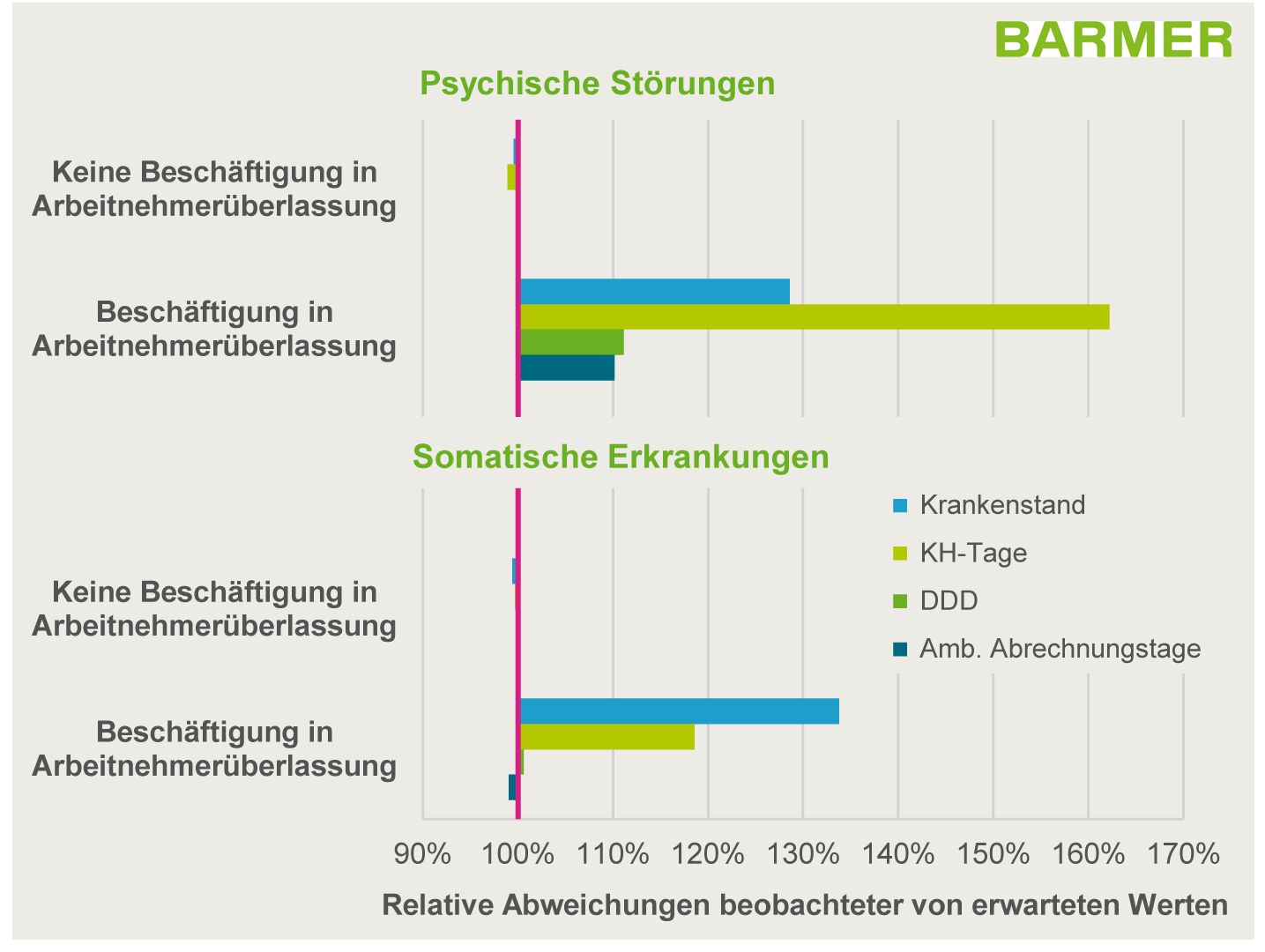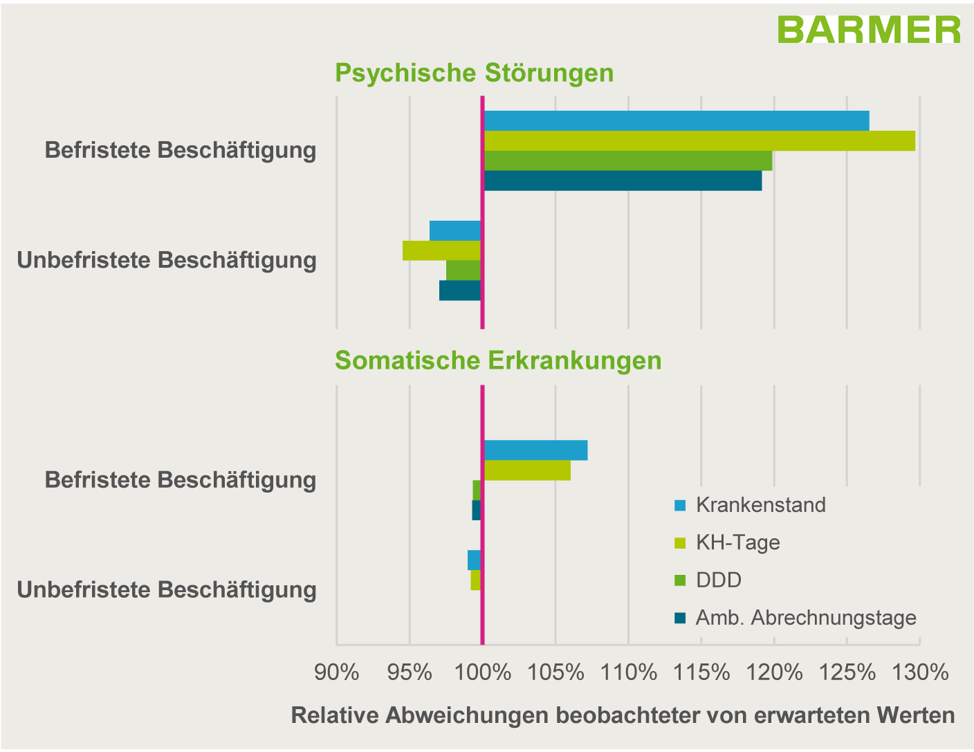 Hinweise für psychische Belastungen durch Arbeitsplatzunsicherheit sieht die Barmer auch in einem höheren Arzneimittelkonsum und längeren Krankenhausaufenthalten. Das Volumen der verordneten Psychopharmaka gemessen in „Daily Defined Doses“ lag bei befristet Angestellten im Jahr 2015 knapp 20 Prozent über dem Durchschnitt, bei unbefristet Beschäftigten knapp zwei Prozent unter dem Durchschnitt. Auch die Verweildauer im Krankenhaus wegen psychischer Erkrankungen war bei Leiharbeitnehmern deutlich länger als gegenüber ihren Kollegen der Stammbelegschaft: im Jahr 2015 überstieg sie diese um über 60 Prozent.