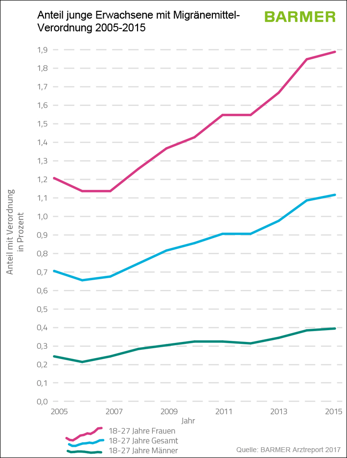 Bereits Kinder leiden unter Migräne. Bis zum Alter von etwa 13 Jahren befinden sich die Migränemittel-Verordnungsraten bei Jungen und Mädchen allerdings auf einem niedrigen Niveau. Mit weiter steigendem Alter kommt es insbesondere bei Mädchen zu einem erheblichen Anstieg der Verordnungsrate. Eine allarmierende Entwicklung zeigen die Verordnungsraten von Migränemitteln bei den 18- bis 27-Jährigen. Sie sind bundesweit in der Zeit von 2005 bis 2015 um 58 Prozent gestiegen. Über alle Altersklassen hinweg sind die Migräne-Verordnungen dagegen lediglich um 9,9 Prozent gewachsen.
