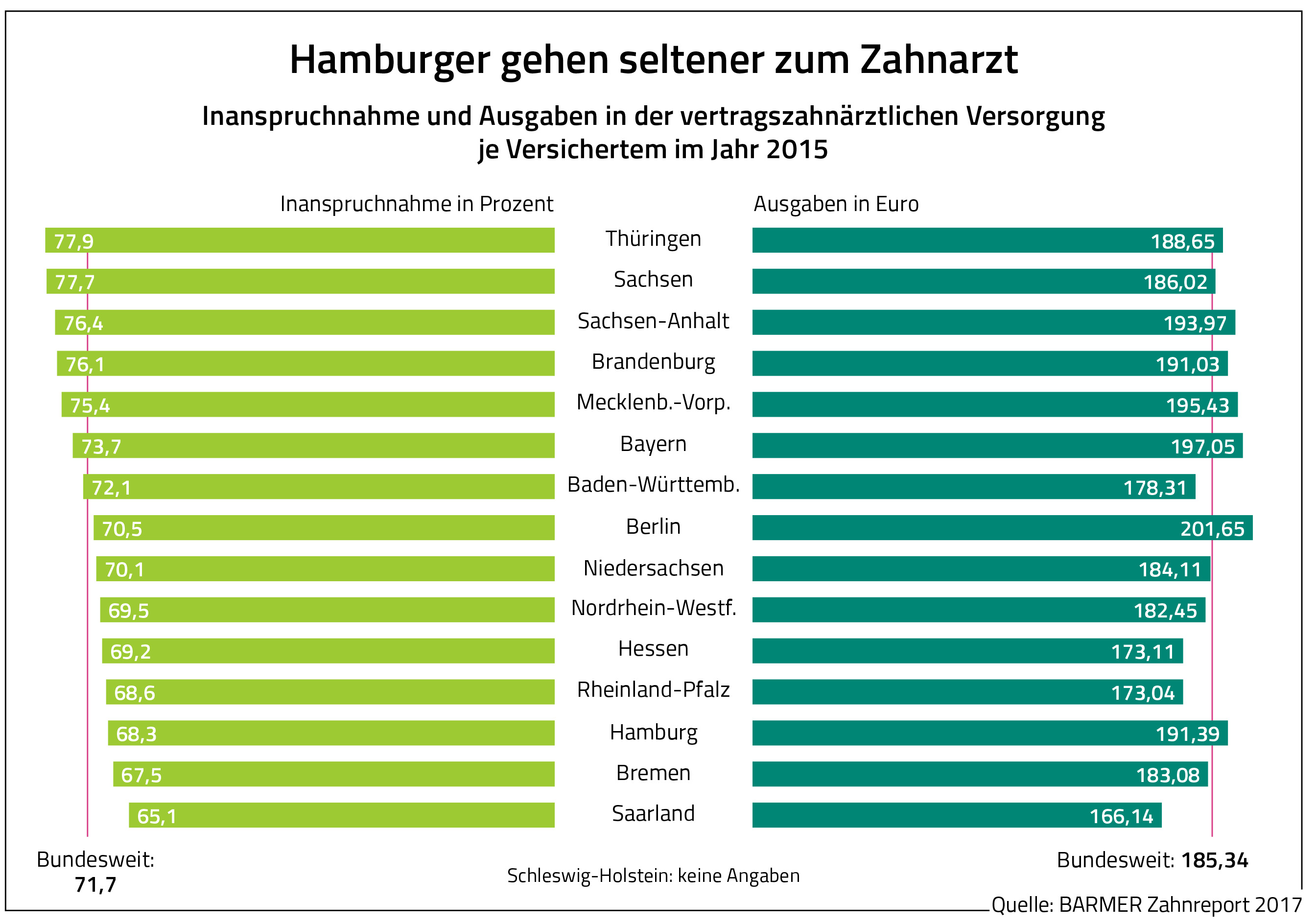 Hamburg, 13. Juni 2017 - Laut aktuellem Barmer Zahnreport nahmen im Jahr 2015 lediglich 68,3 Prozent der Hamburger einen Zahnarzt in Anspruch. Hamburg liegt damit 3,4 Prozentpunkte unter dem Bundesdurchschnitt. „Dabei ist Vorsorge das A und O einer guten Zahngesundheit. Nicht umsonst bezahlten Krankenkassen jedes halbe Jahr eine allgemeine Kontrolluntersuchung beim Zahnarzt, einmal im Jahr die Entfernung des Zahnsteines und alle zwei Jahre eine Parodontitis-Untersuchung“, erläutert Frank Liedtke, Landesgeschäftsführer der Barmer in Hamburg.