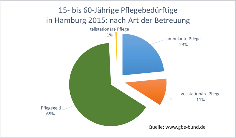 - 15-60-jährige Pflegebedürftige in Hamburg: Eine Mehrheit von 65 Prozent (3.970 Betroffene) wird von Angehörigen daheim und ohne externe Hilfe gepflegt. Dafür erhalten Sie Pflegegeld. 23 Prozent holen sich ambulante Unterstützung. 11 Prozent leben in einem Pflegeheim - das sind lediglich 646 Pflegebedürftige.