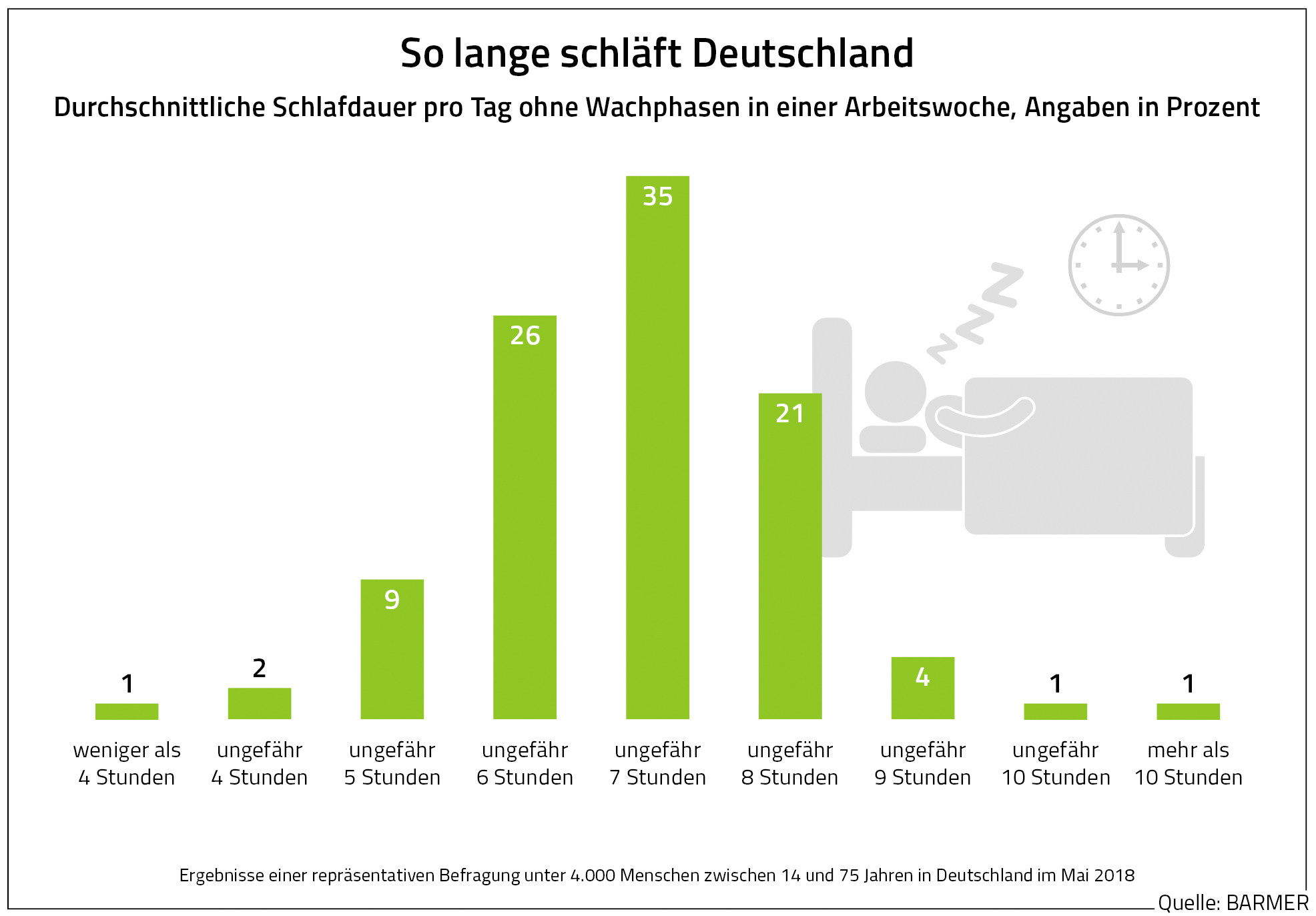 33 Prozent von denen, die elektronische Geräte permanent im Schlafzimmer haben, bleiben häufig oder immer länger auf als beabsichtigt. Von denen, die ohne Elektronik im Schlafzimmer auskommen, sind dies nur 15 Prozent. 36 Prozent der Bevölkerung beklagen zudem Einschlafprobleme. „Die Digitalisierung bietet im Alltag enorme Chancen und Potenziale. Unsere Befragung zur Schlafgesundheit in Deutschland zeigt aber auch, dass es sinnvoll ist, nicht permanent online zu sein“, so Frank Liedtke, Landesgeschäftsführer der Barmer in Hamburg. Dies sei allein schon deshalb wichtig, da ausreichender guter Schlaf Voraussetzung für körperliche und seelische Gesundheit sei. 38 Prozent der Befragten schlafen jedoch in einer typischen Arbeitswoche nur sechs Stunden und weniger. 18 Prozent sind mit ihrem Schlaf voll und ganz zufrieden. Insgesamt waren im Mai im Zuge der Barmer-Erhebung 4.000 Menschen bundesweit online befragt worden.