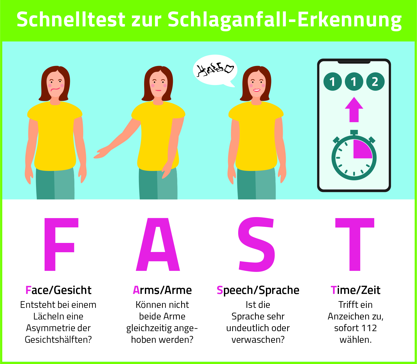 Bei einem Schlaganfall kommt es zu einer Unterversorgung der Gehirnzellen mit Sauerstoff und sie sterben ab. Ob die Ursache eine Blutung oder eine Verstopfung eines Blutgefäßes im Gehirn ist, kann nur die bildgebende Diagnostik zeigen. Nach diesem Befund richtet sich dann die weitere Therapie. Warnzeichen für einen Schlaganfall können plötzlich beginnende, extrem starke Kopfschmerzen, Sprach-, Seh- und Gleichgewichtsstörungen, Taubheitsgefühle oder Lähmungserscheinungen sein. Mit drei kleinen Tests können Außenstehende einschätzen, ob solche Ausfallserscheinungen vorliegen. Der oder die Betroffene soll versuchen, zu lächeln, die Arme nach vorn zu strecken und einen einfachen Satz nachzusprechen. Liegen Nervenschäden vor, so ist das Gesicht beim Lächeln verzogen, die Arme können nicht oder nur schwer gleichzeitig angehoben werden, und die Sprache ist unklar. In diesem Fall, aber auch beim Erstverdacht auf einen Schlaganfall, sollte sofort die 112 gewählt werden.