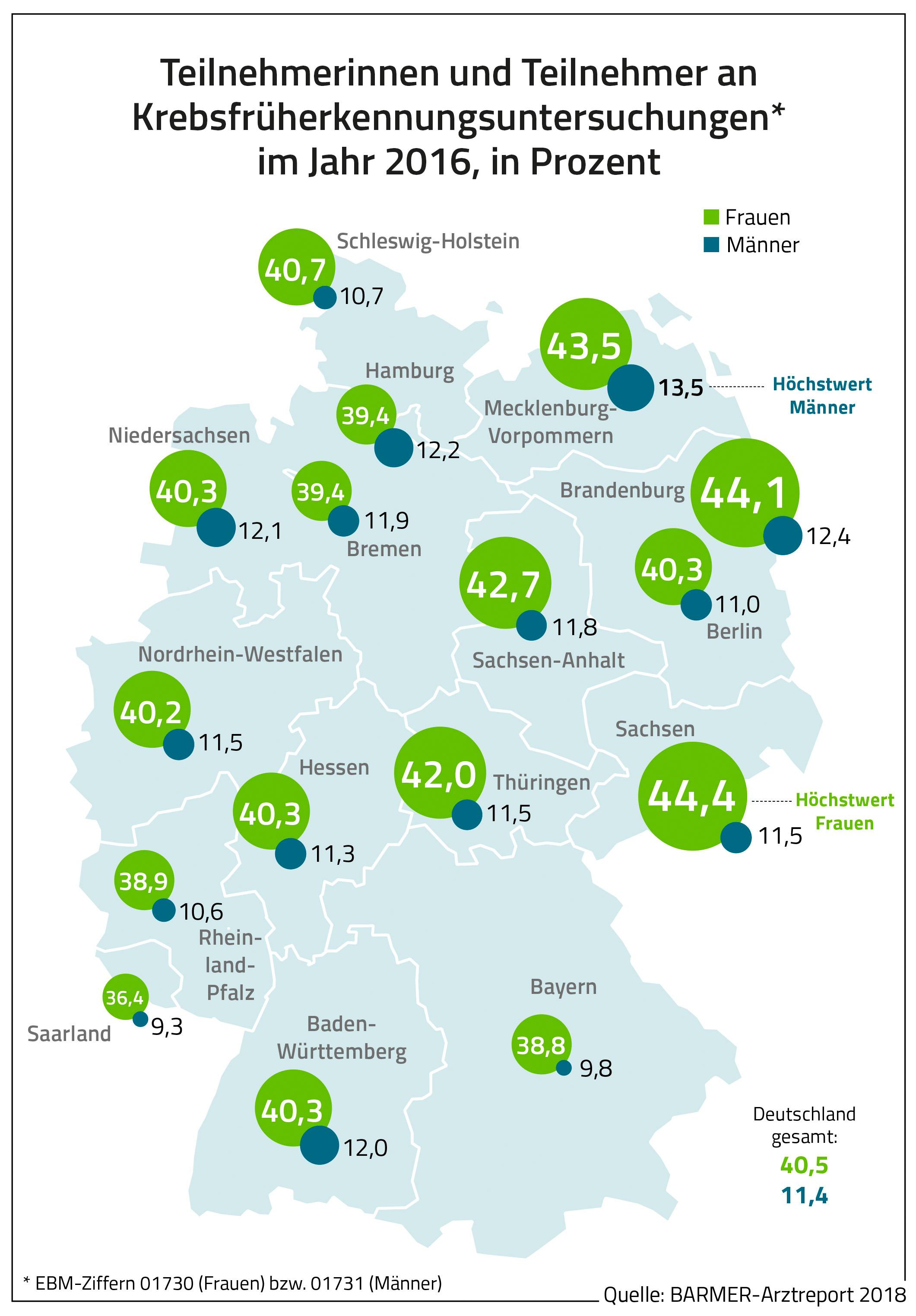 Hamburg, 13. Juni 2018 – Vorsorgeuntersuchungen können Leben retten. Doch bei weitem nicht jeder Versicherte nimmt die kostenlosen Routine-Checks wahr. So sind nach dem aktuellen Barmer-Arztreport nur 39,4 Prozent der Hamburgerinnen und 12,2 Prozent der Hamburger im Jahr 2016 zur Krebsfrüherkennung gegangen. Dabei übernehmen die Krankenkassen für Frauen ab 20 Jahren jährlich den Vorsorgetest gegen Brustkrebs und ab 30 Jahren gegen Gebärmutterhalskrebs. Für Männer ab 45 gibt es den Prostata-Check. Zudem bestehen Vorsorgetests für Haut- und Dickdarmkrebs für beide Geschlechter.
