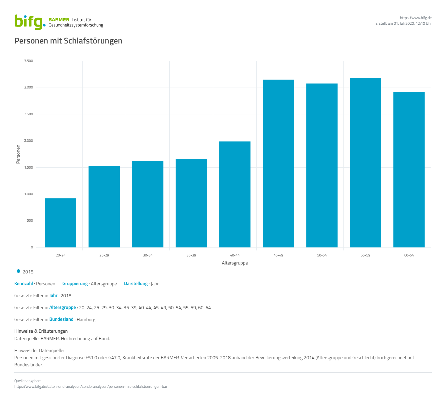 Basierend auf Routinedaten der Barmer werden unter der Rubrik Sonderanalysen aktuelle Auswertungen vorgenommen. Beispielsweise kann hier nachvollzogen werden, wie viele Personen in den Jahren 2005 bis 2018 die Diagnose Schlafstörung erhielten. Gefiltert nach Bundesland und Altersgruppen lässt sich so entnehmen, dass in Hamburg vor allem 45- bis 64-Jährige von Schlafstörungen betroffen sind.