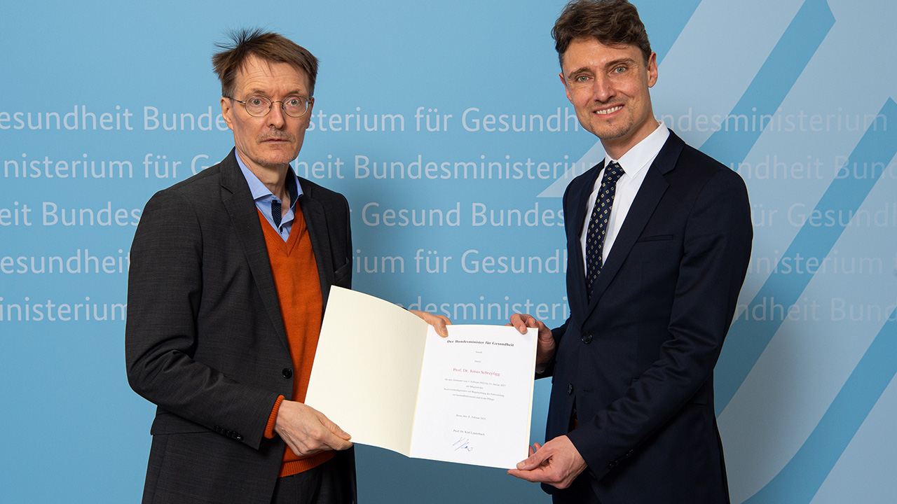 Bundesgesundheitsminister Karl Lauterbach (SPD) übergibt Prof. Jonas Schreyögg die Ernennungsurkunde als Mitglied im Sachverständigenrat Gesundheit und Pflege.