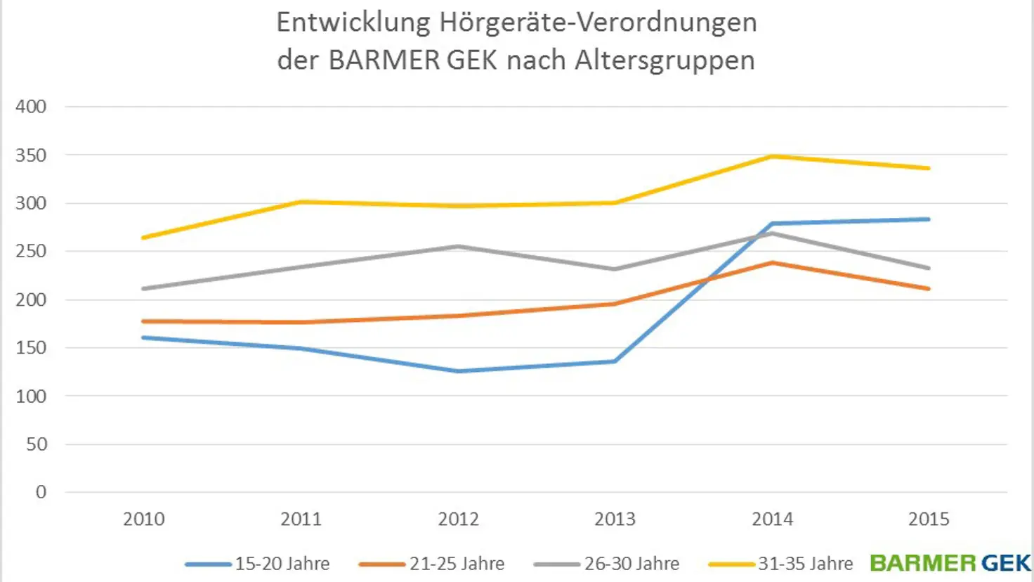 In Hamburg wurden 2015 in der Altersgruppe 15 bis 35 Jahre insgesamt 26 Hörgeräte verordnet. Bei den Teenagern im Alter von 15 bis 20 Jahren waren es in den letzten beiden Jahren immerhin insgesamt 16 Hörgeräte. In den vier Jahren davor (2010-2013) waren es dagegen zusammen nur drei Hörgeräte.