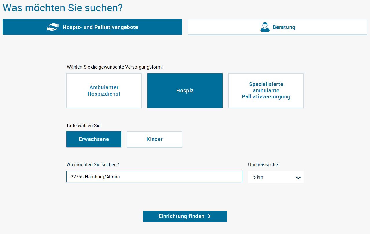 Nutzer des Suchportals wählen zunächst zwischen ambulanten Hospizdiensten, stationären Hospizen und SAPV-Leistungserbringern. Nach der Eingabe von Postleitzahl und Wohnort werden Anschrift, Entfernung und Kontaktdaten der nächstgelegenen Einrichtungen oder Leistungserbringer angezeigt.