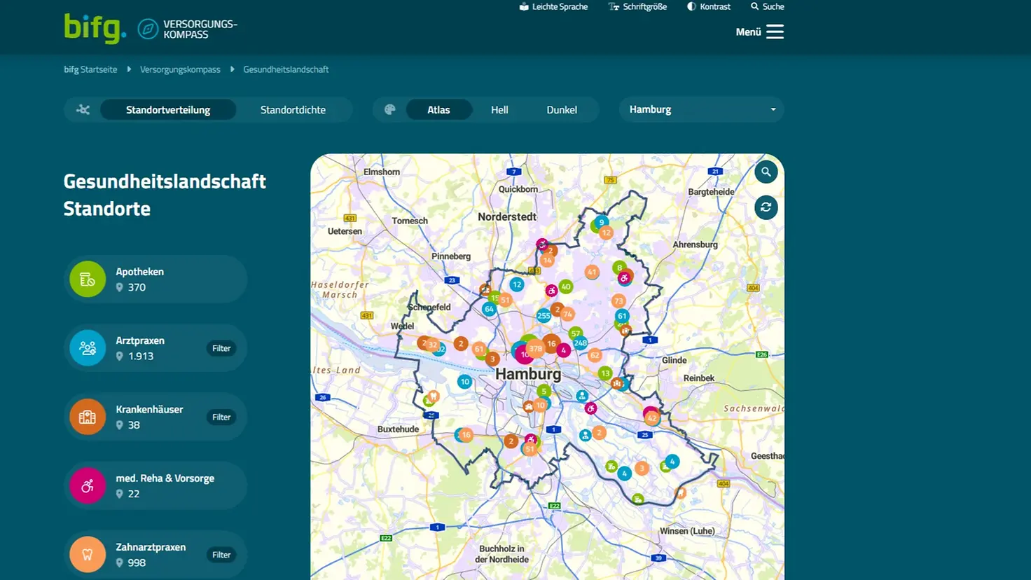 Die Karte zeigt auch die Versorgungsdichte einer Region, also die Anzahl medizinischer Dienstleister im Verhältnis zur Einwohnerzahl. Die Barmer-Gesundheitslandschaft bietet praktische Hilfe und dient als Instrument für versorgungspolitische Überlegungen. Die Datenbasis bilden Abrechnungsdaten der Barmer und Krankenhausdaten des Dienstleisters trinovis. Mehr Informationen unter: https://www.bifg.de/versorgungskompass/gesundheitslandschaft.