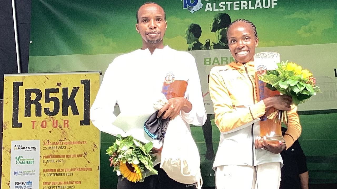 Stellten bei ihren Siegen jeweils neue Rekorde auf: Calistus Kimtai Kitoo und Purity Kajuju Gitonga gewinnen den Barmer Alsterlauf 2023.