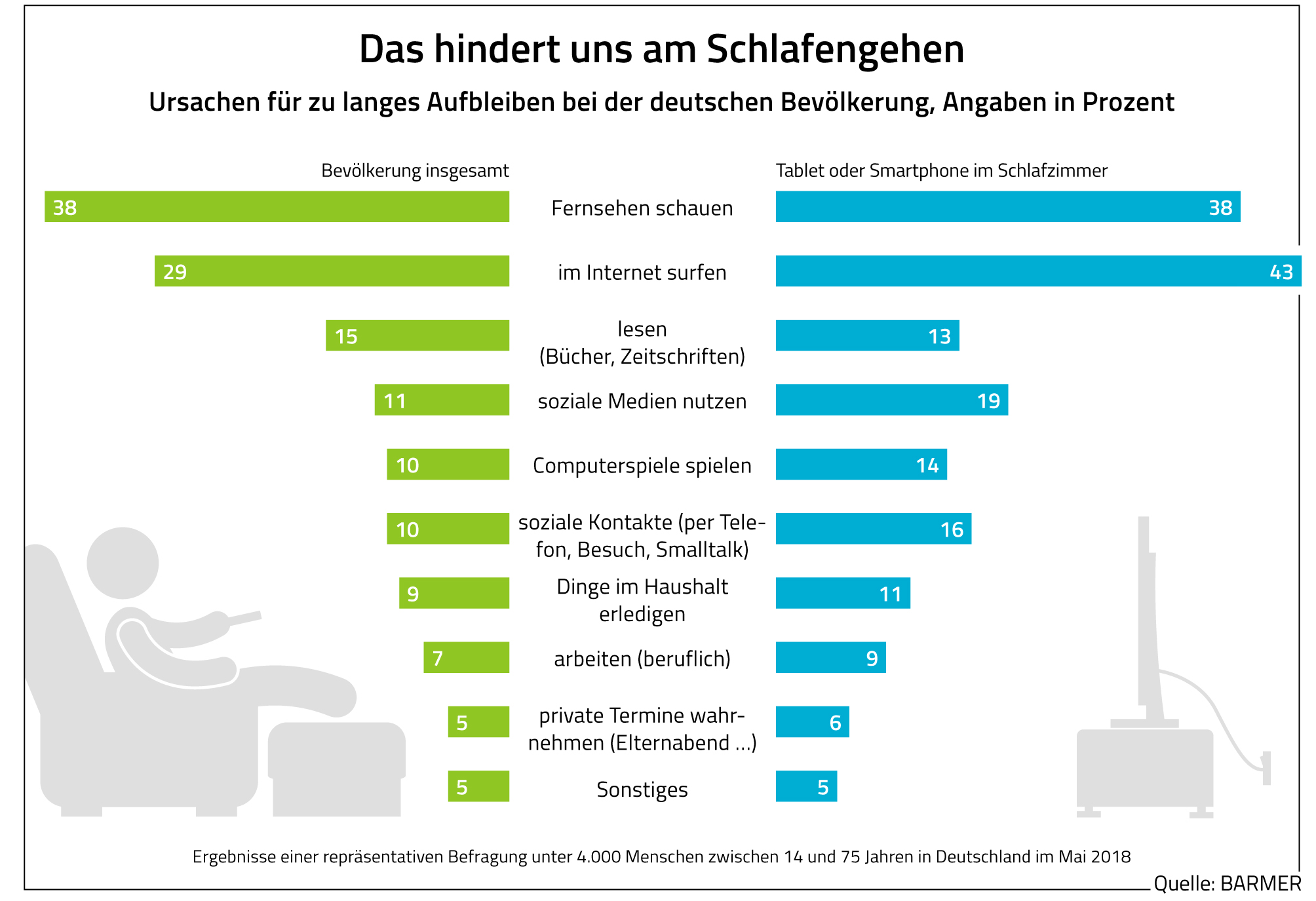 33 Prozent von denen, die elektronische Geräte permanent im Schlafzimmer haben, bleiben häufig oder immer länger auf als beabsichtigt. Von denen, die ohne Elektronik im Schlafzimmer auskommen, sind dies nur 15 Prozent. 36 Prozent der Bevölkerung beklagen zudem Einschlafprobleme. 38 Prozent der Befragten schlafen in einer typischen Arbeitswoche nur sechs Stunden und weniger. 18 Prozent sind mit ihrem Schlaf voll und ganz zufrieden.