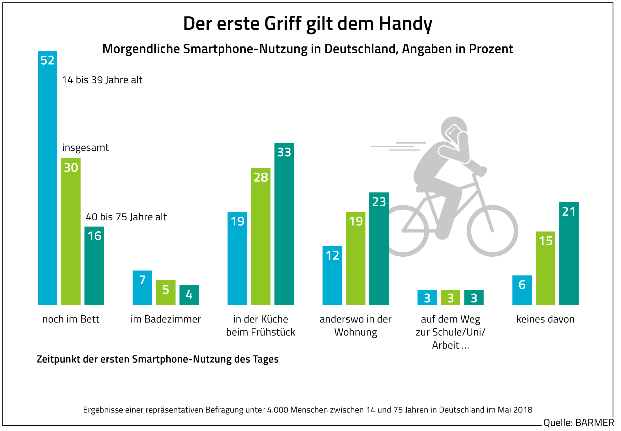 Elektronische Kommunikationsmittel begleiten den Ergebnissen zufolge die Deutschen von der ersten Minute des Tages an. So werden 30 Prozent der Befragten noch im Bett medial aktiv, 28 Prozent tun dies beim Frühstück, weitere 19 Prozent kurz vor Verlassen der Wohnung. Mit 65 Prozent wird das Smartphone als Medium noch vor dem Aufstehen am häufigsten genutzt. Radio und Fernseher kommen auf nur zehn bzw. neun Prozent. Direkt vor dem Schlafen liegt der Fernseher dagegen mit 36 Prozent Nutzung noch vor dem Smartphone, dessen sich im Bett immerhin 29 Prozent der Deutschen bedienen.