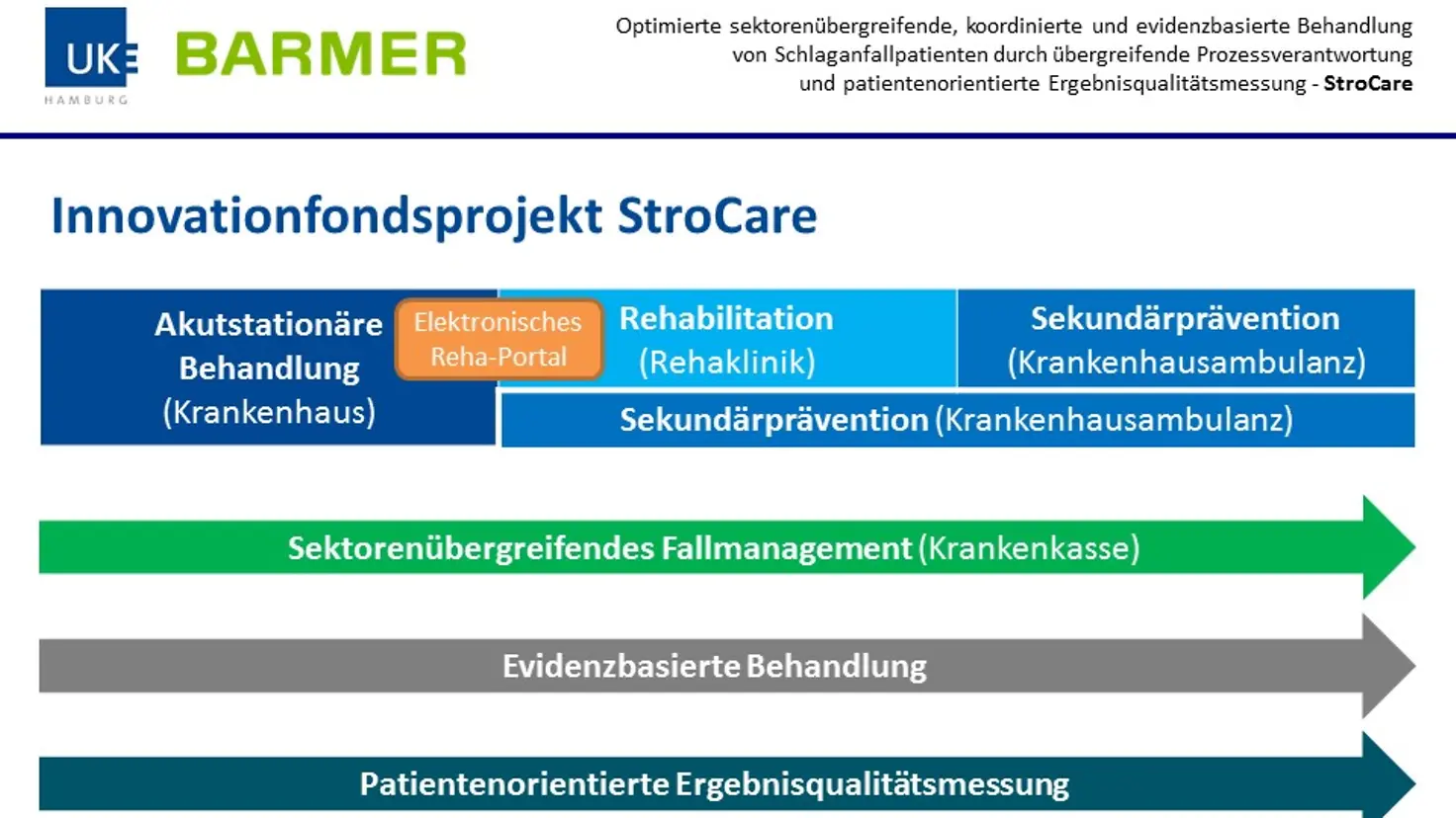 Das Projekt StroCare wird über den Innovationsfonds mit 3.794.200 € über einen Zeitraum von vier Jahren gefördert. Konsortialführer ist das Universitätsklinikum Eppendorf. Weitere Partner sind zwei Akutkrankenhäuser Albertinen-Krankenhaus (Hamburg) und Elbe Kliniken in Stade (NDS) sowie fünf Rehabilitationskliniken, darunter RehaCentrum Hamburg auf dem Gelände des UKE und am Berliner Tor, Klinikum Bad Bramstedt, MediClin Klinikum Soltau, Helios Klinik Geesthacht und Helios Rehaklinik Damp für Neurorehabilitation. Die elektronische Plattform für den Datenaustausch zwischen den Akut- und Rehakliniken wird von der Philips-Tochterfirma Forcare bereitgestellt. Die Barmer Landesvertretung Hamburg übernimmt als Konsortialpartner und einzige Krankenkasse gemeinsam mit dem IT-Dienstleister Lohmann & Birkner das Fallmanagement.