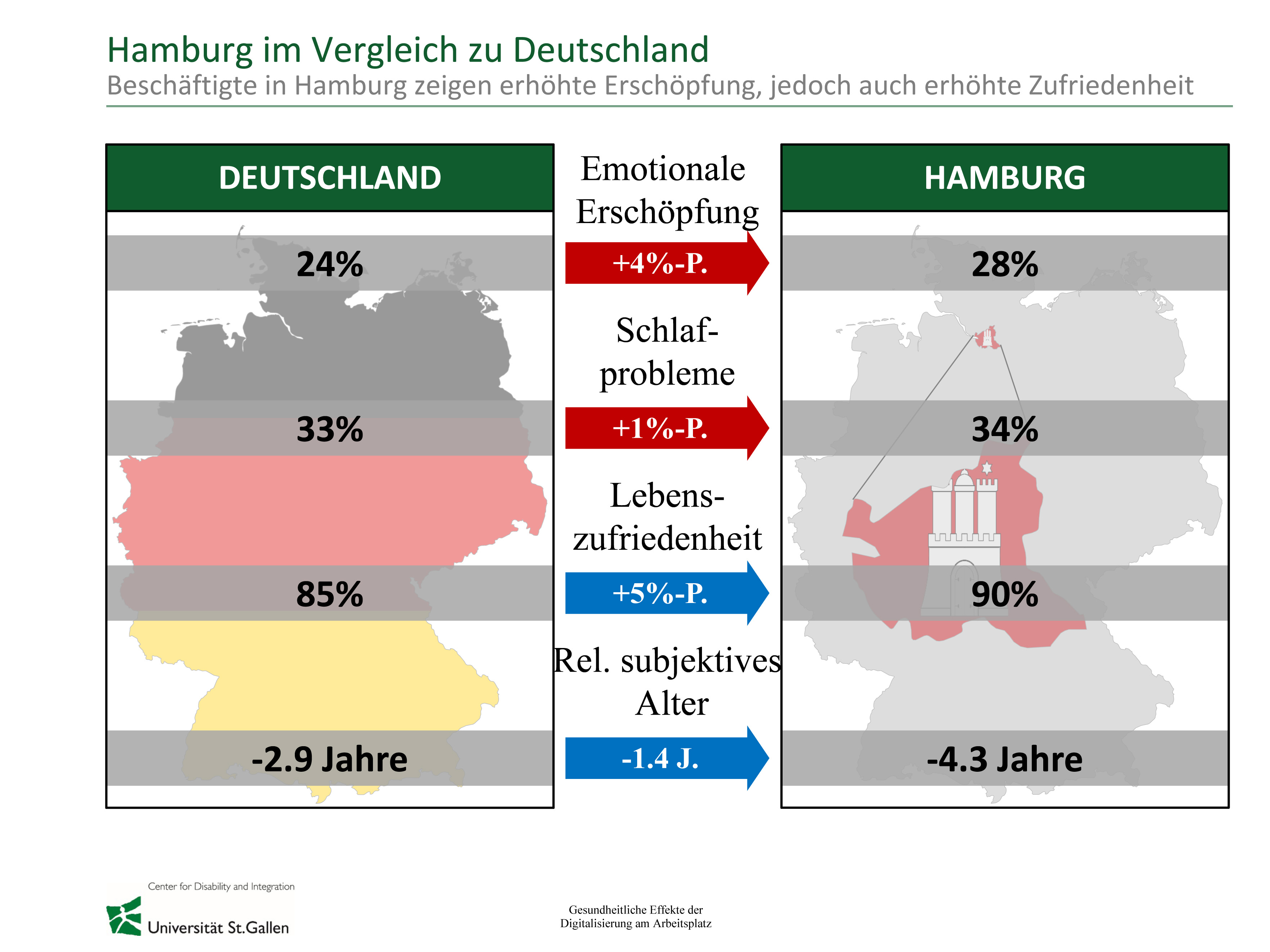 Am 1. November 2018 präsentierte die Barmer im Rahmen des diesjährigen Hamburger Unternehmerforums eine repräsentative Längsschnittstudie der Universität St. Gallen zur Digitalisierung der Arbeitswelt. Daraus geht hervor, dass die Digitalisierung am Arbeitsplatz die Gesundheit und Zufriedenheit von Arbeitnehmern stärken kann. Dies gilt umso mehr, wenn die Beschäftigten den Einsatz digitaler Technologien zu Arbeitszwecken während der Freizeit begrenzen.