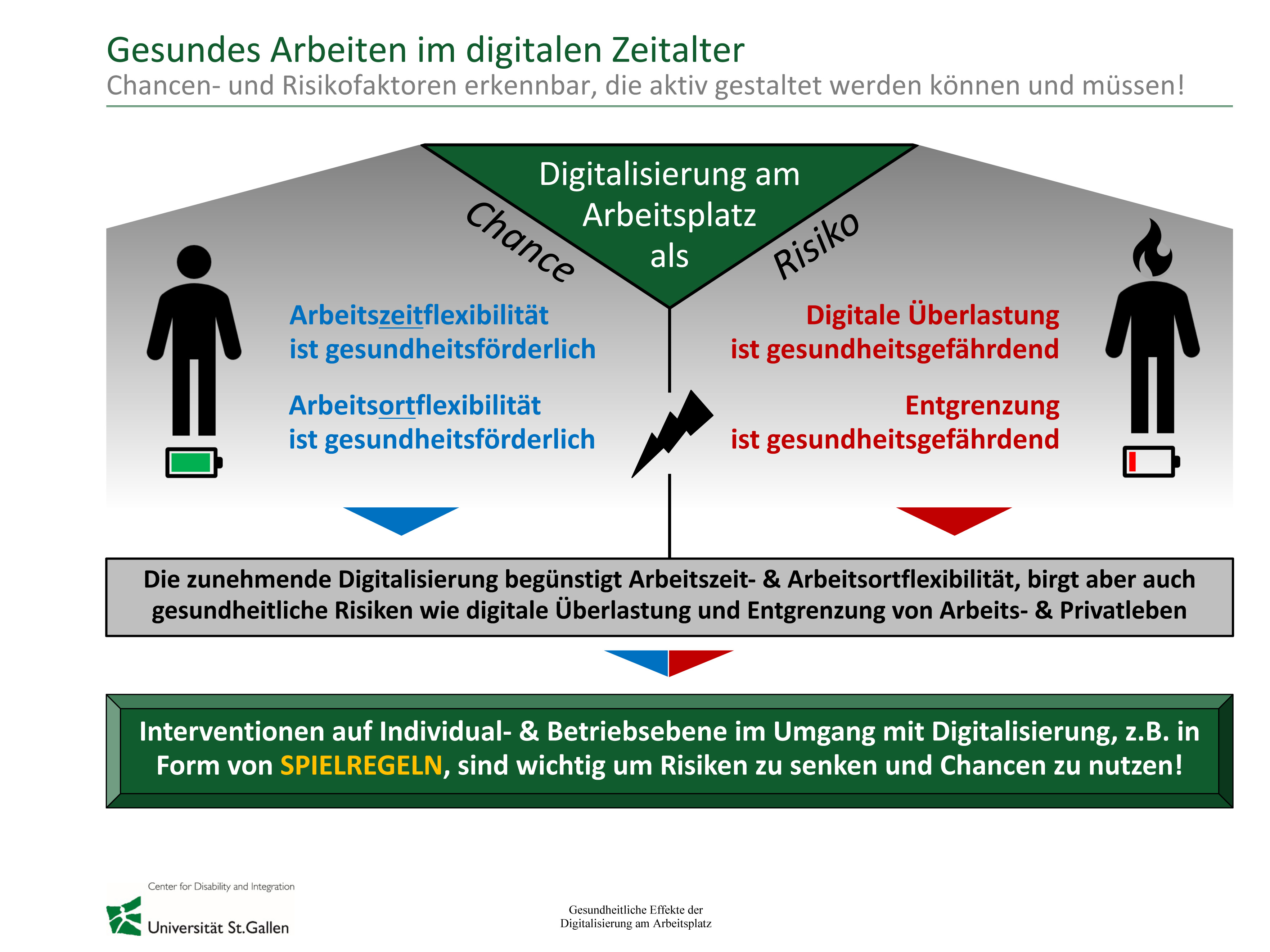 „Die Flexibilisierung von Arbeitsort und -zeit ist wichtig und zu begrüßen. Auf der anderen Seite nimmt durch flexible Arbeit und die Digitalisierung generell auch die digitale Überlastung zu“, so Studienautor Prof. Dr. Stephan Böhm von der Universität St. Gallen. So hätten 15 Prozent der Befragten angegeben, sich digital überlastet zu fühlen. Besonders betroffen sind dabei junge Erwerbstätige sowie Beschäftigte in der Unternehmensführung und -organisation (20 Prozent) und den IT- und naturwissenschaftlichen Dienstleistungsberufen (18 Prozent). Daher sei es notwendig, Chancen und Risiken zu berücksichtigen und den Einsatz digitaler Technologien auf ein gesundes Maß zu begrenzen.