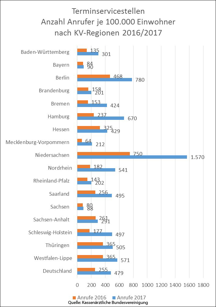 In Hamburg ist das Anrufvolumen je 100.000 Einwohner von 2016 auf 2017 um 183 Prozent gestiegen. Einen stärkeren Anstieg gab es nur in den KV-Bezirken Mecklenburg-Vorpommern (231 Prozent) und Nordrhein (197 Prozent).