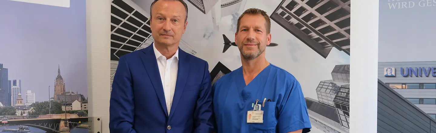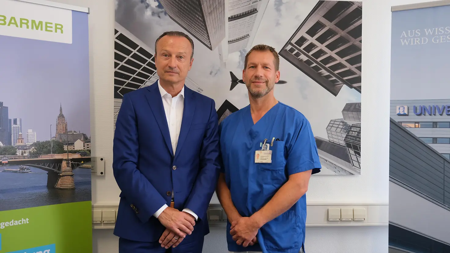 Martin Till, Landesgeschäftsführer Hessen BARMER, und Prof. Dr. Dr. Kai Zacharowski, Direktor der Klinik für Anästhesiologie, Intensivmedizin und Schmerztherapie am Universitätsklinikum Frankfurt, begrüßen den neuen Versorgungsstandard im Patient Blood Management (PBM).