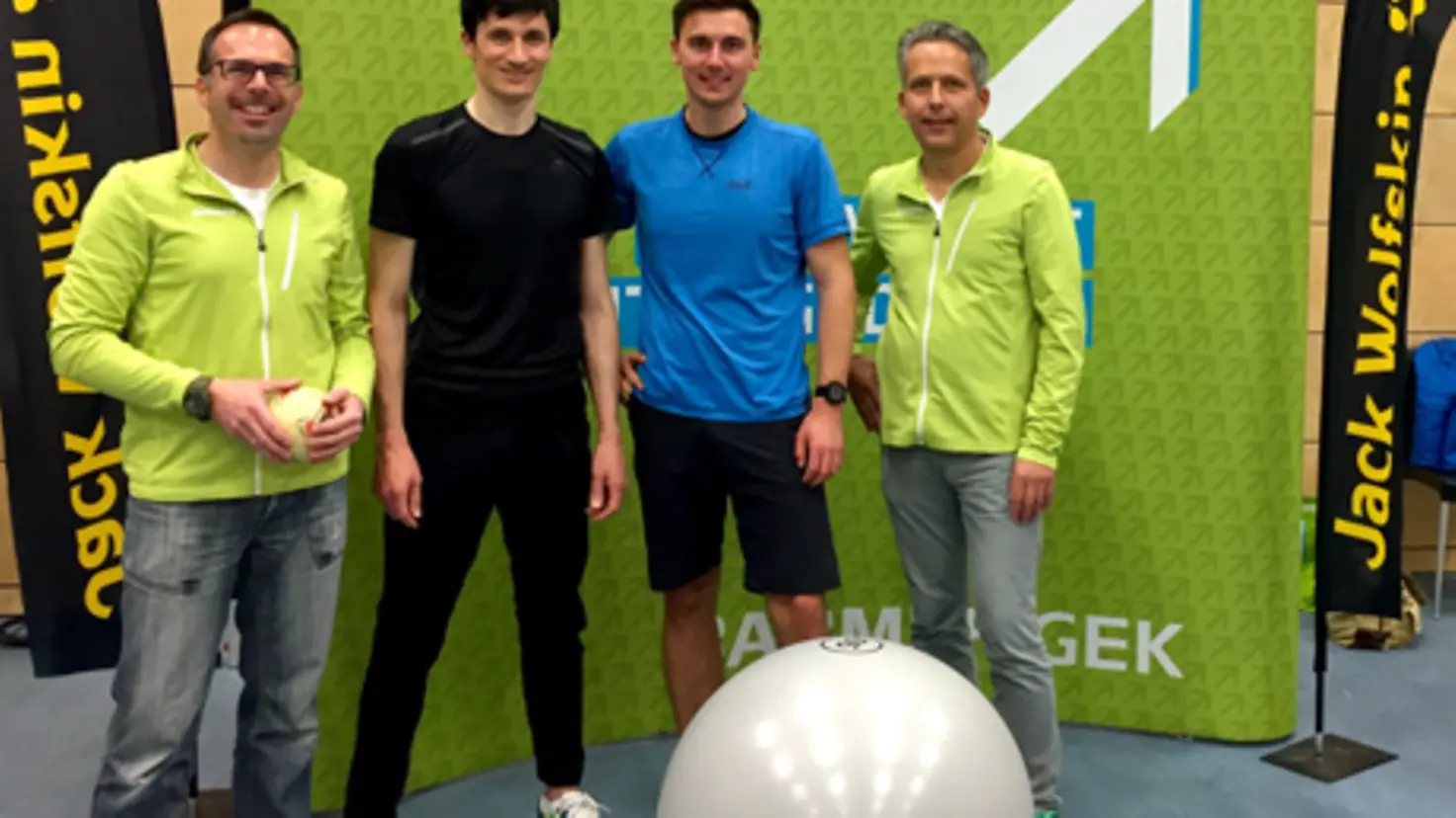 Sie sorgten für eine gelungene Aktion im Rahmen des betriebliches Gesundheitsmanagement (BGM): Ex-Skispringer und Olympiasieger Martin Schmitt und Dennis Duras, Health und Sportmanager bei Jack Wolfskin (Mitte), sowie die BGM Experten von der Barmer GEK Thorsten Andres (l.) und Jörg Steinbrück (r.) Foto: Barmer GEK