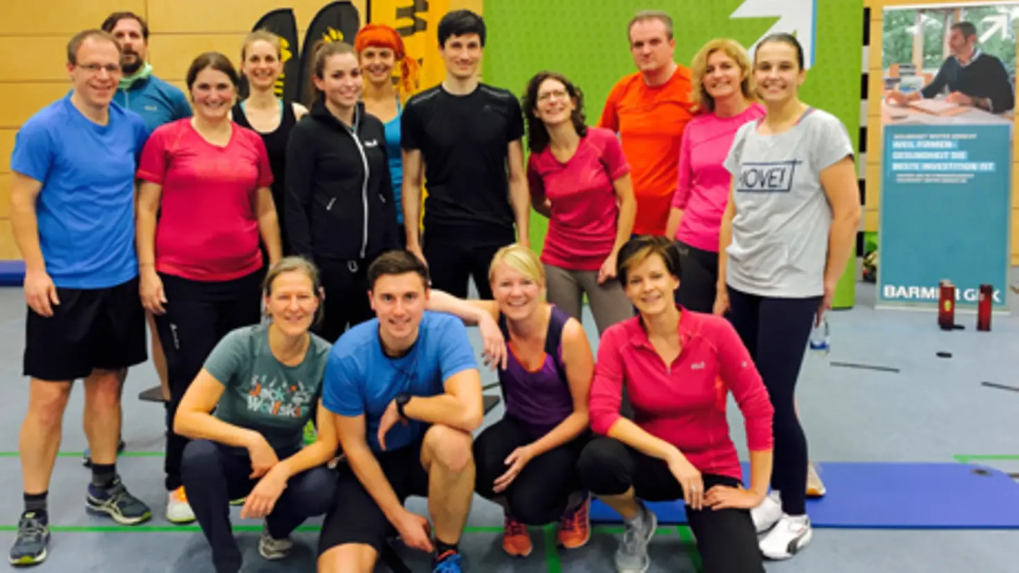 Die Mitarbeiterinnen und Mitarbeiter von Jack Wolfskin aus Idstein waren begeistert vom Workout mit Martin Schmitt (Mitte hinten). Foto: Barmer GEK