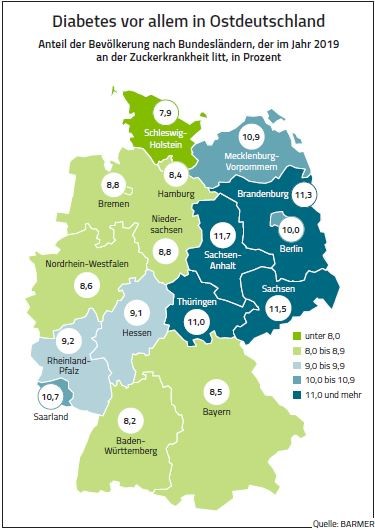 Wie aus der Analyse weiter hervorgeht, tritt Diabetes mellitus verstärkt in den ostdeutschen Bundesländern auf. Die höchsten Prävalenzraten gab es im vergangenen Jahr in Sachsen-Anhalt mit 11,7 Prozent, Sachsen (11,5 Prozent) und Brandenburg (11,3 Prozent). Dagegen diagnostizierten die Ärztinnen und Ärzte nur bei 7,9 Prozent der Einwohner von Schleswig-Holstein und 8,2 Prozent in Baden-Württemberg die Zuckerkrankheit. „Nicht nur in Regionen mit vielen Diabetikerinnen und Diabetikern bedarf es einer verstärkten Ernährungsbildung. Hier muss man möglichst früh ansetzen, da sich Essgewohnheiten bereits in der Kindheit manifesteren. Deshalb sollte das Thema gesunde Ernährung in den Schullehrplänen verbindlich verankert werden, damit bereits Kinder dafür sensibilisiert werden“, so Till. Erforderlich seien auch verpflichtende Standards für eine gesunde Kita- und Schulverpflegung.
