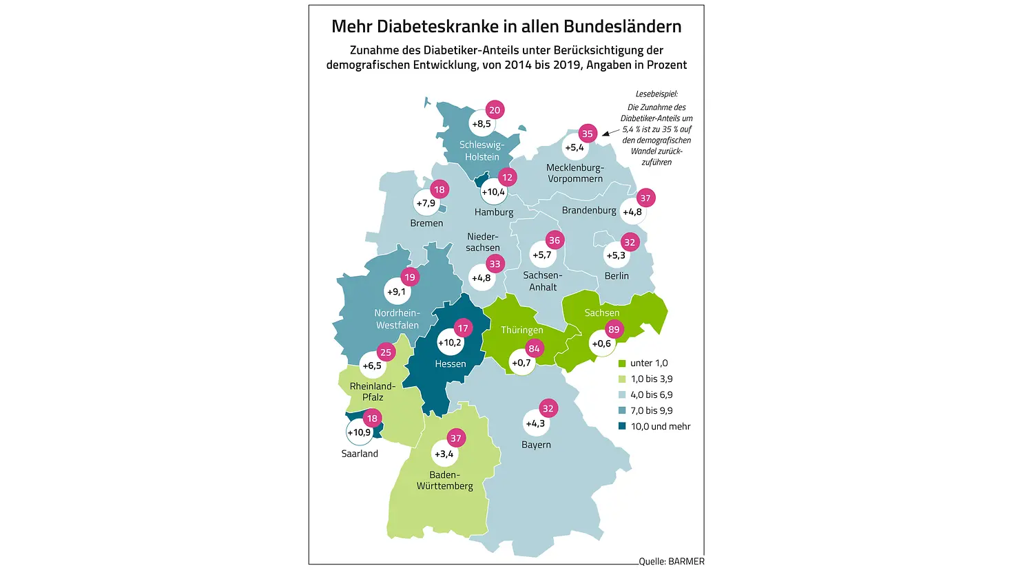 Grafik: Mehr Diabeteskranke in allen Bundesländern – Zunahme des Diabetiker Anteils unter Berücksichtigung der demografischen Entwicklung, von 2014 bis 2019, Angaben in Prozent