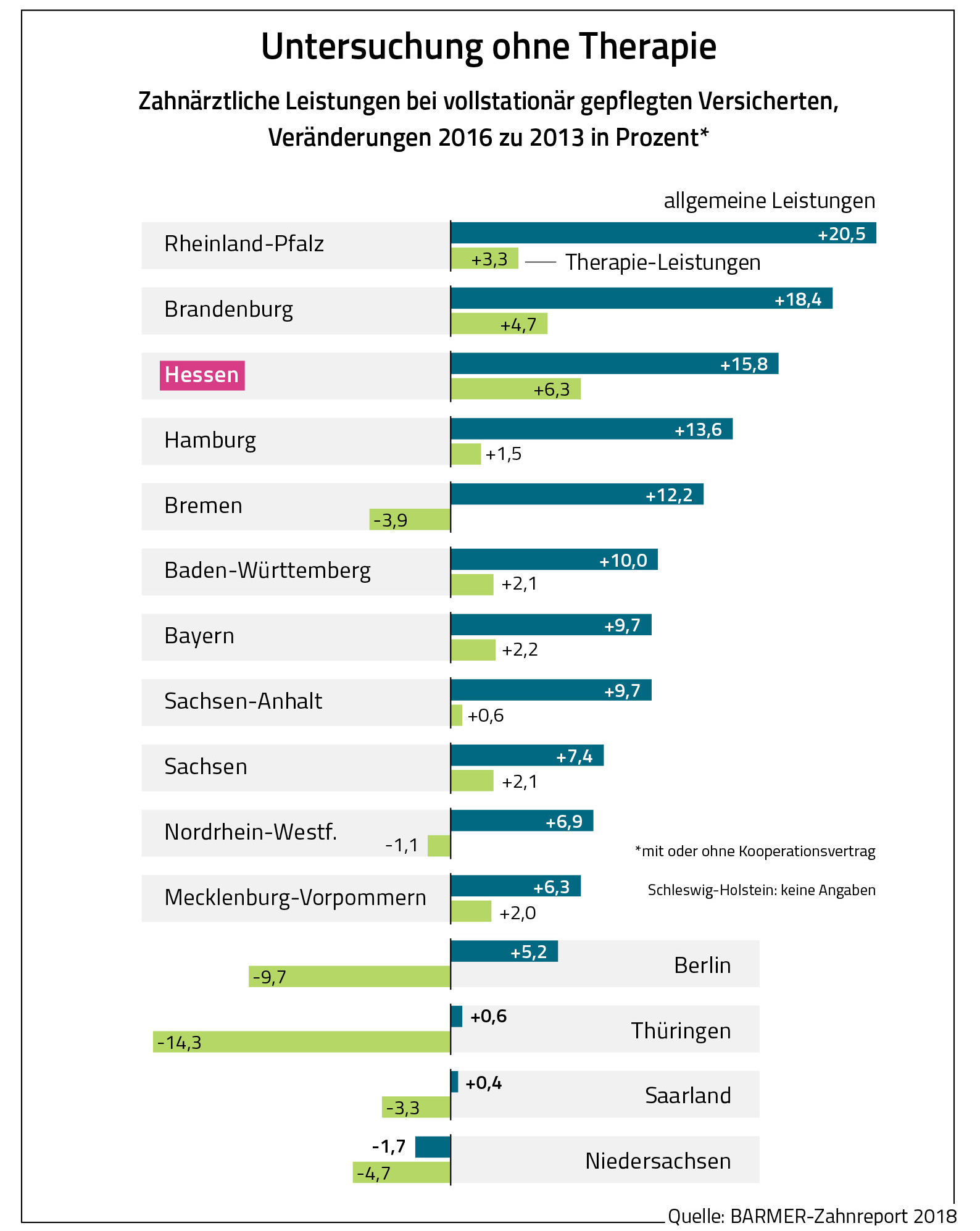 Seit über vier Jahren haben Vertragszahnärzte die Möglichkeit, einzeln oder gemeinsam Kooperationsverträge mit stationären Pflegeeinrichtungen abzuschließen. Von den rund 850 Pflegeheimen in Hessen haben 325 Einrichtungen (Stand Juni 2018) insgesamt 373 Kooperationsverträge abgeschlossen. „Mit Einführung der neuen und modifizierten Gebührennummern ist die zahnärztliche Versorgung von pflegebedürftigen Senioren nachweislich verbessert worden“, so Norbert Sudhoff. Er verweist dabei auf den aktuellen Barmer Zahnreport, der sich in Analysen, Auswertungen und Befragungen schwerpunktmäßig der vertragszahnärztlichen Versorgung pflegebedürftiger Senioren widmet. Bei 15,1 Prozent der vollstationär gepflegten Versicherten in Hessen wurden im Jahr 2016 zahnärztliche Kontakte abgerechnet – eine Steigerung um 15,8 Prozent gegenübet dem Jahr 2013. Im gleichen Zeitraum wurden auch mehr zahnärztlichen Therapieleistungen abgerechnet. Eine Steigerung von 6,3 Prozent – im bundesweiten Vergleich der beste Wert.