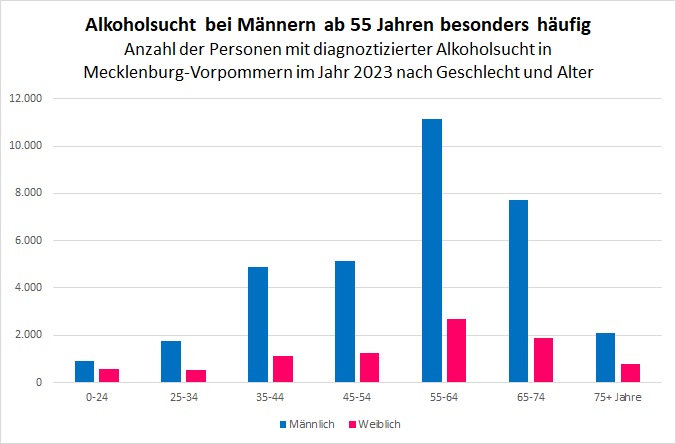 Auswertungen von BARMER-Versichertendaten, hochgerechnet auf die reale Bevölkerungsstruktur in Mecklenburg-Vorpommern. Erfasst wurden alle Personen, für die im Jahr 2023 mindestens einmal eine ICD Diagnose F10 (Psychische und Verhaltensstörungen durch Alkohol) im ambulanten oder stationären Bereich (Haupt- oder Nebendiagnose) abgerechnet wurde.