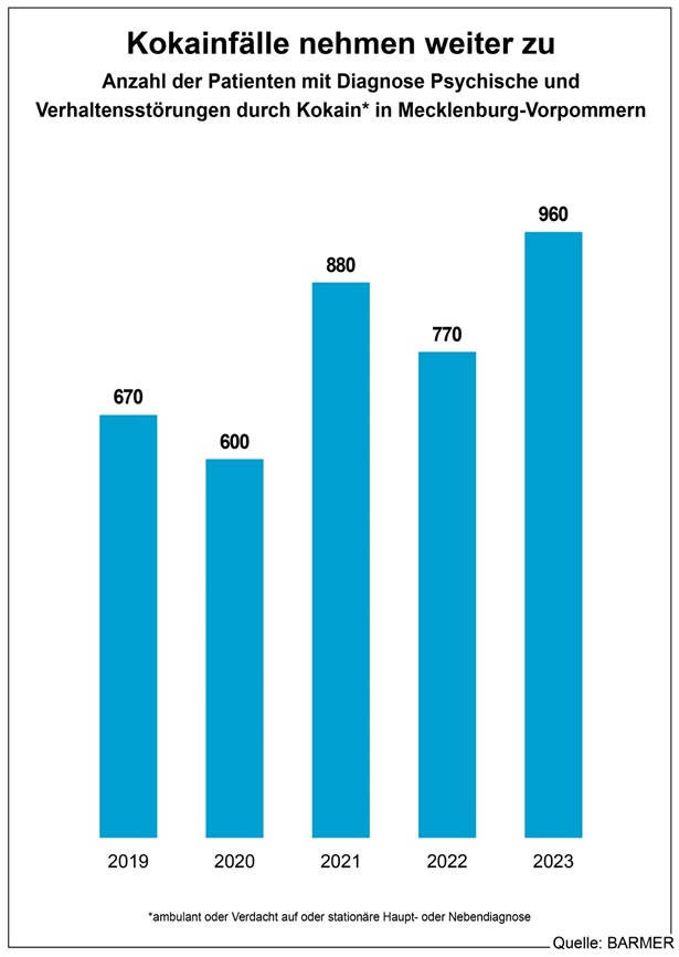Schwerin, 30. Dezember 2024 – Immer mehr Menschen in Mecklenburg-Vorpommern sind wegen Kokainmissbrauchs in ärztlicher Behandlung. Das geht aus einer aktuellen Auswertung des Barmer Instituts für Gesundheitssystemforschung (bifg) hervor. Demnach gab es im Jahr 2019 landesweit 670 behandelte Patientinnen und Patienten und im vergangenen Jahr 960. Bundesweit lag die Anzahl im Jahr 2023 bei rund 65.000 Patienten. Die meisten Betroffenen mit 15.280 wurden in Nordrhein-Westfalen behandelt, gefolgt von Niedersachsen mit 7.760. Die wenigsten Patienten gab es im Saarland mit 490 und in Thüringen mit 810 Frauen und Männern. „Die Zunahme an Behandlungen wegen Kokainmissbrauchs in Mecklenburg-Vorpommern ist Besorgnis erregend. Das wahre Ausmaß wird noch viel größer sein, da wir nur den Bruchteil der Betroffenen in ärztlicher Behandlung sehen. Auch die aktuelle bundesweite Kriminalstatistik zeigt, dass die Zahl der Kokaindelikte im Vergleich von 2022 zu 2023 um gut 27 Prozent gestiegen ist und damit einen neuen Höchststand erreicht hat“, sagt Henning Kutzbach, Landesgeschäftsführer der Barmer in Mecklenburg-Vorpommern.