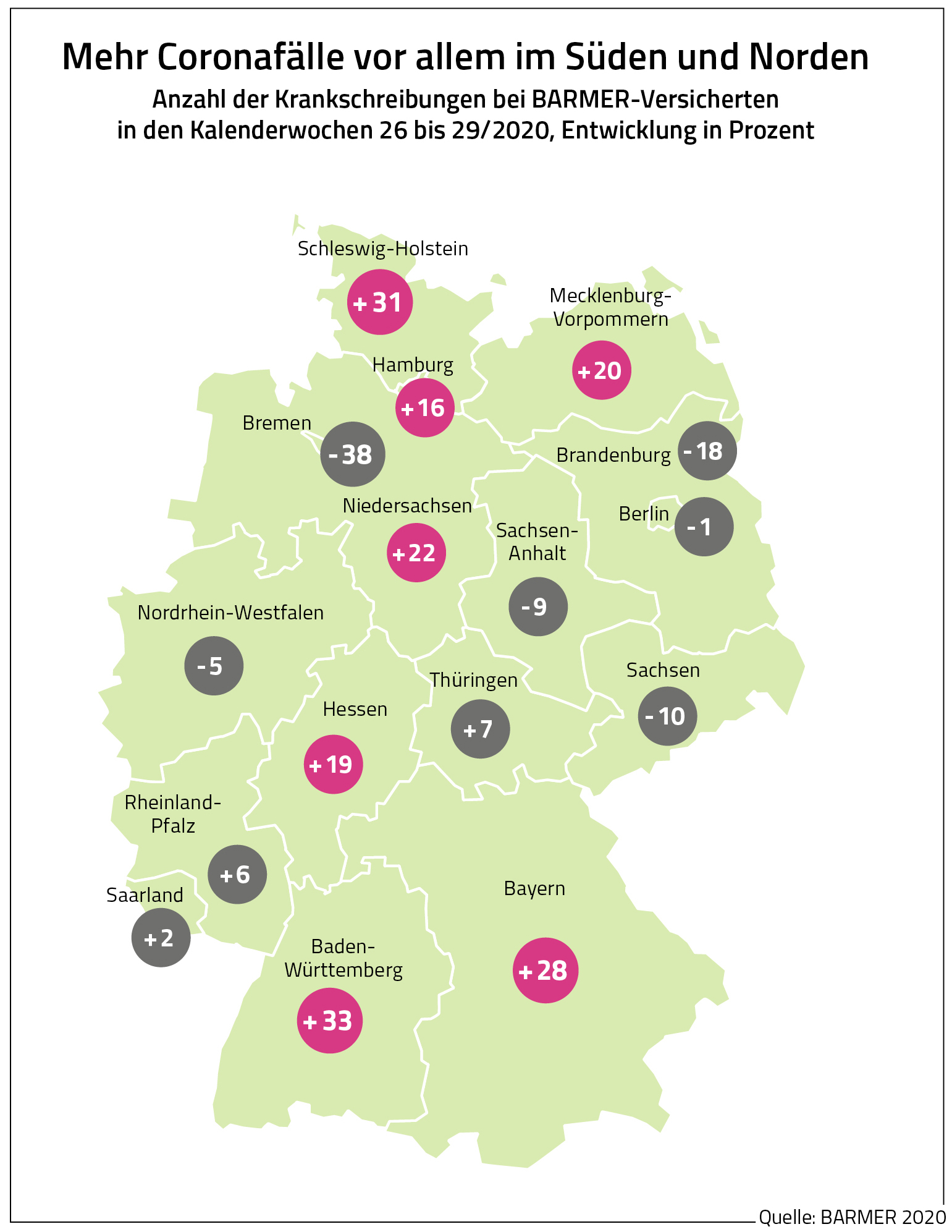 Die Gesamtzahlen der Corona-Krankschreibungen haben sich den Ergebnissen der Auswertung zufolge regional sehr unterschiedlich entwickelt. In Mecklenburg-Vorpommern stieg die Zahl der Krankschreibungen von der 26. bis zur 29. Kalenderwoche über alle Altersklassen hinweg um 20 Prozent (von 40 auf 48 Betroffene). Den größten Anstieg verzeichnete Baden-Württemberg mit einem Plus von 33 Prozent (von 240 auf 318 Krankgeschriebene). Dem folgen Schleswig-Holstein mit einem Zuwachs von 31 Prozent (von 54 auf 71 Betroffene) und Bayern mit 28 Prozent (von 475 auf 607 Krankgeschriebene). Dagegen gingen in Brandenburg (minus 18 Prozent) und Sachsen (minus zehn Prozent) die Fallzahlen deutlich zurück.