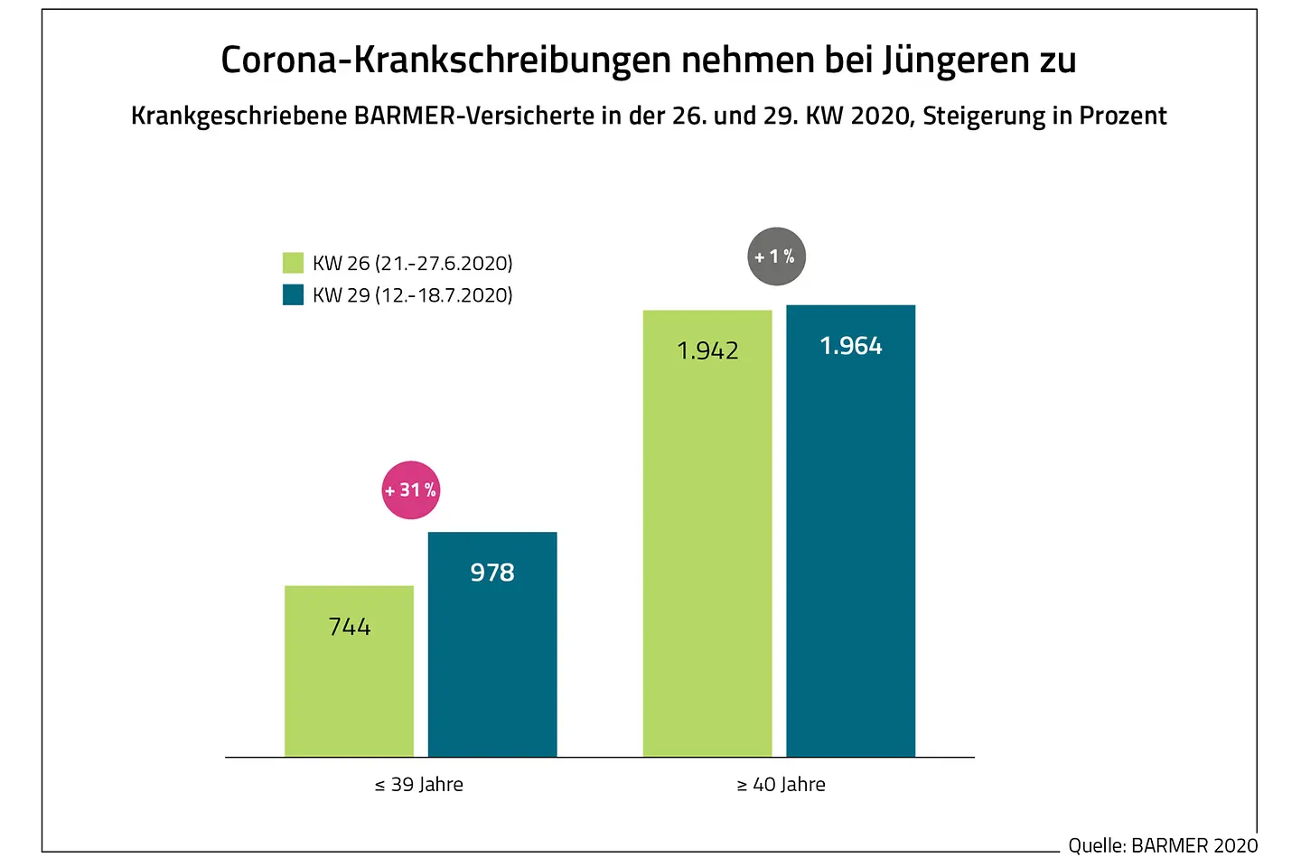 Schwerin, 10. August 2020 – Bei jungen Menschen sind die Krankschreibungen wegen einer COVID-19-Infektion in den letzten Wochen wieder deutlich angestiegen. Das geht aus einer neuen Auswertung der Barmer hervor. Innerhalb von vier Wochen (vom 21. Juni bis 18. Juli) sind demnach die Fallzahlen in der Gruppe der bis 39-Jährigen bundesweit um 31 Prozent gestiegen, von 744 auf 978 Barmer-Versicherte.