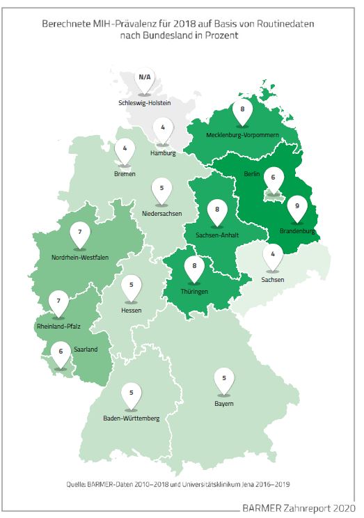 Der Anteil an MIH-erkrankten Kindern variiert regional sehr stark. So waren in Hamburg und Bremen vier Prozent der Sechs- bis Zwölfjährigen betroffen, in Brandenburg sogar neun Prozent. Es zeigt sich zudem ein Trend, dass in den ostdeutschen Flächenländern (mit Ausnahme von Sachsen) die Betroffenenquoten höher liegen als im Rest der Republik. „Vorsorgeuntersuchungen beim Zahnarzt werden in den neuen Bundesländern traditionell stärker wahrgenommen“, erklärt Henning Kutzbach. Daher würden die Muster für Kreidezähne öfter erkannt, was die höhere Rate der Betroffenheit erklärt. „Wir appellieren deshalb an Eltern und Erziehende, die vorgesehenen Untersuchungen für Kinder und Jugendliche noch stärker zu nutzen, um frühzeitig Erkrankungen und Entwicklungsstörungen im Zahn-, Mund- und Kieferbereich zu erkennen“, so Kutzbach.