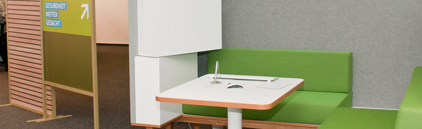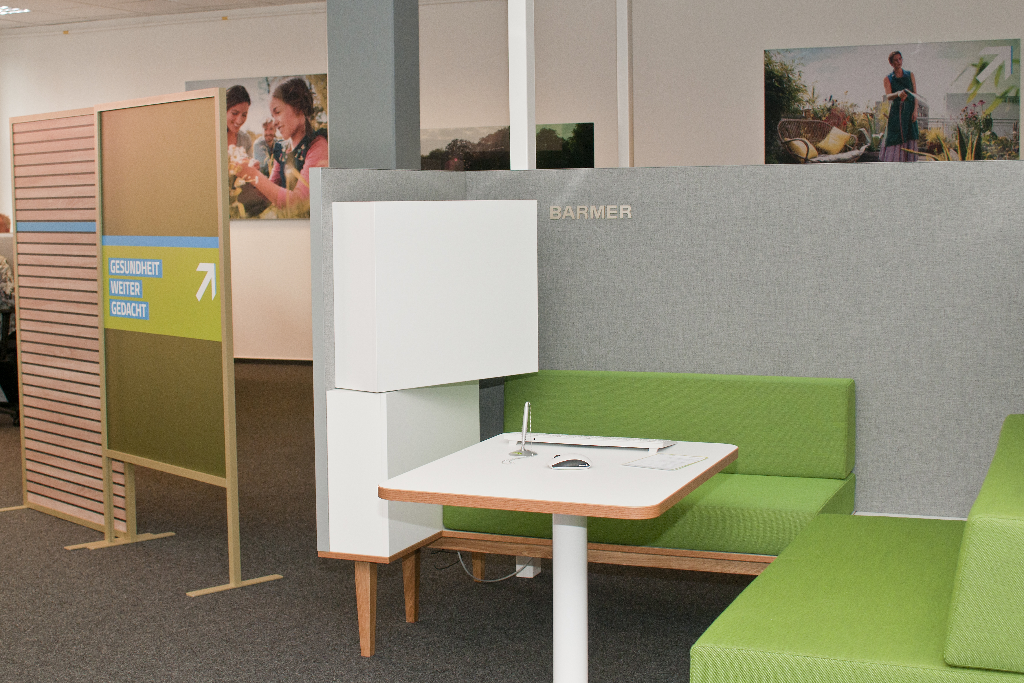 „Wir möchten weg von der Beratung am Schreibtisch hin zum Dialog auf Augenhöhe. Daher haben wir für vertrauliche Gespräche bequeme Beratungsbereiche mit Computern“, sagt Saupe. Der gemeinsame Blick auf den Bildschirm schaffe Transparenz über alle Vorgänge. Schalldämmende Trennwände um die Beratungszonen sorgen für Diskretion, zudem gibt es ein separates Besprechungszimmer.
