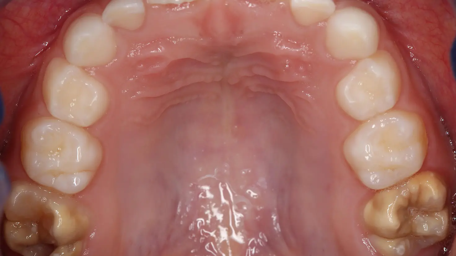 Kariesfreies Gebiss eines 7-jährigen Patienten mit MIH an beiden oberen ersten Backenzähen. Foto: Prof. Dr. Katrin Bekes, MME Wien/DGZMK